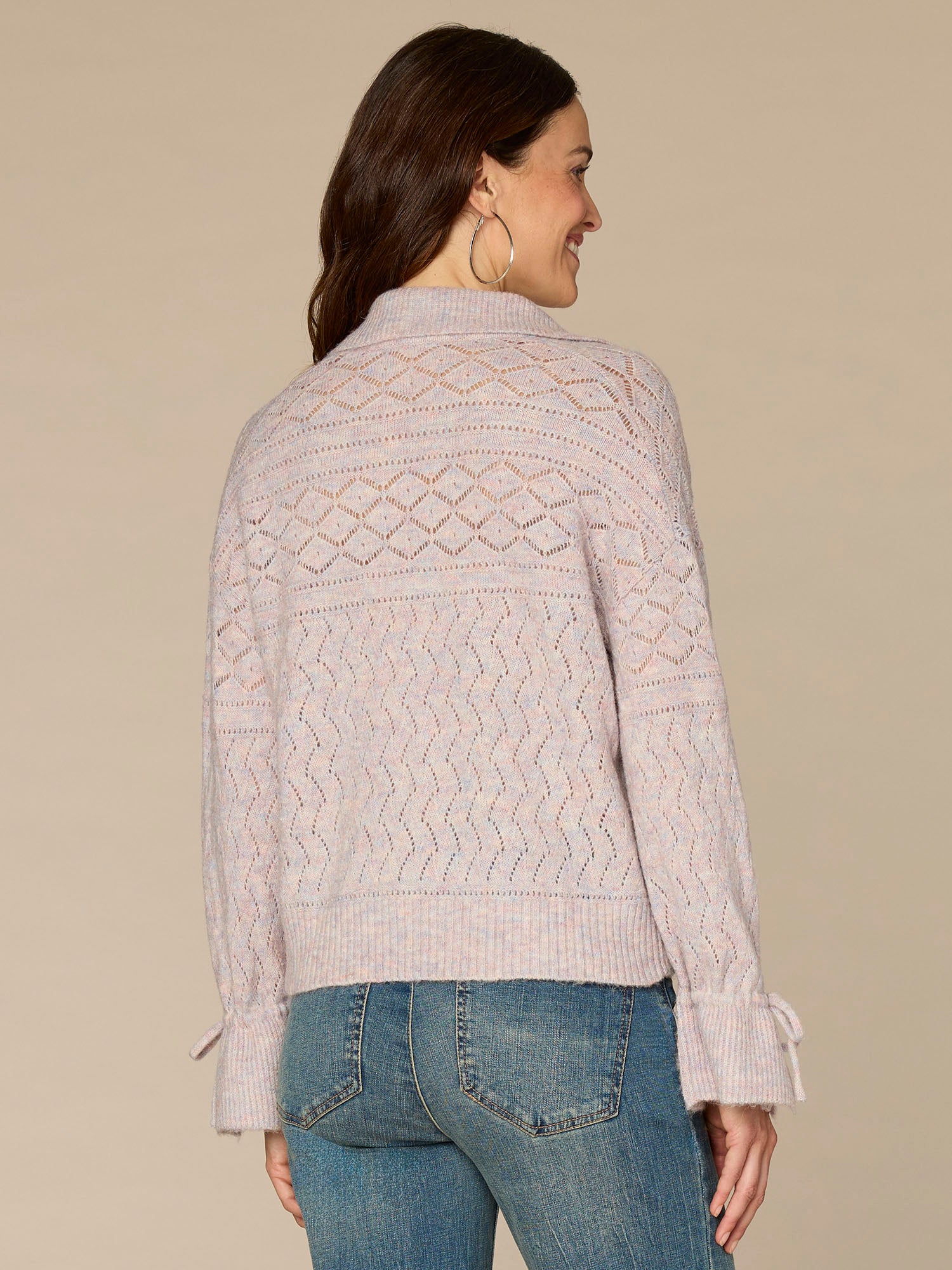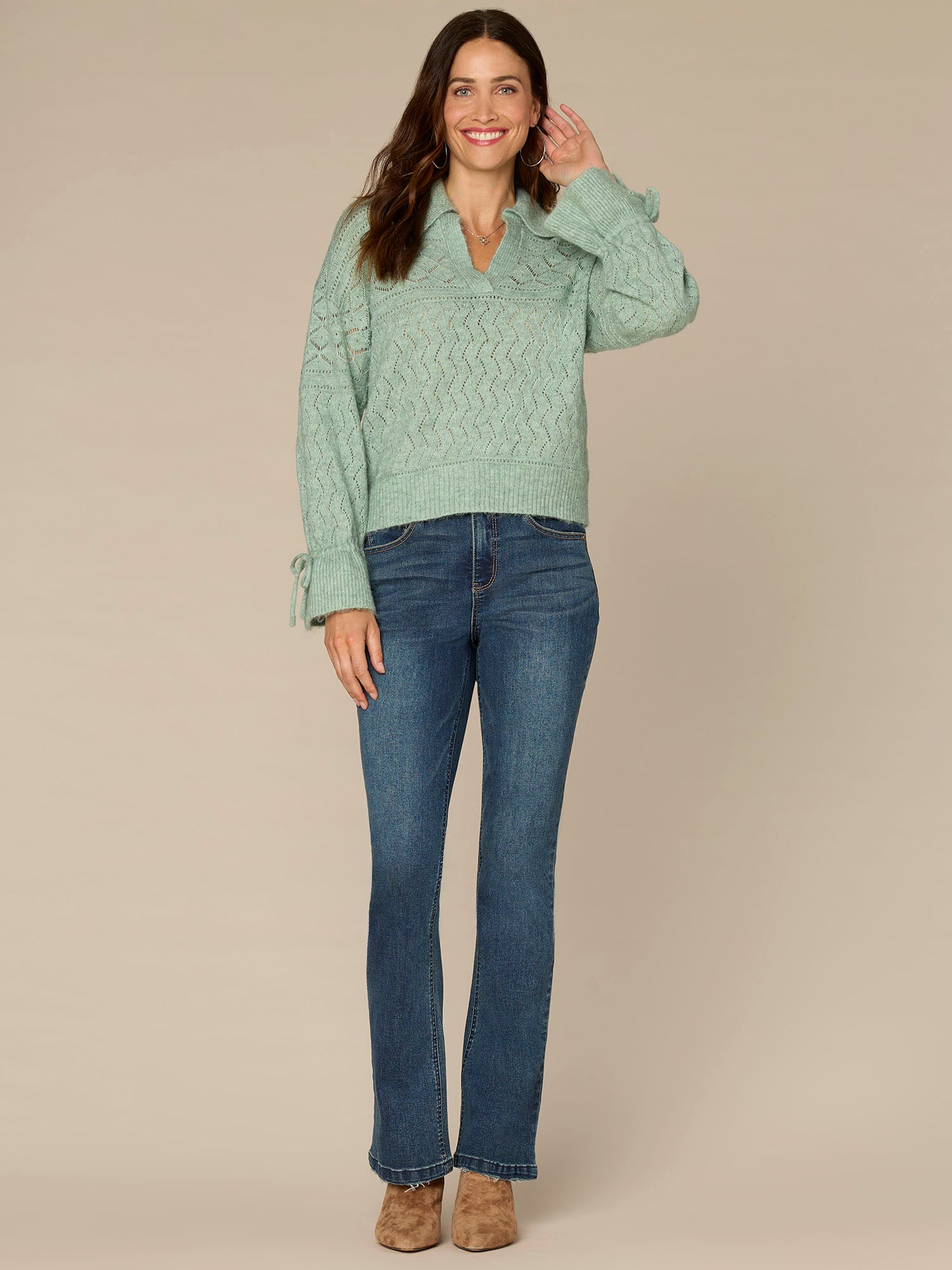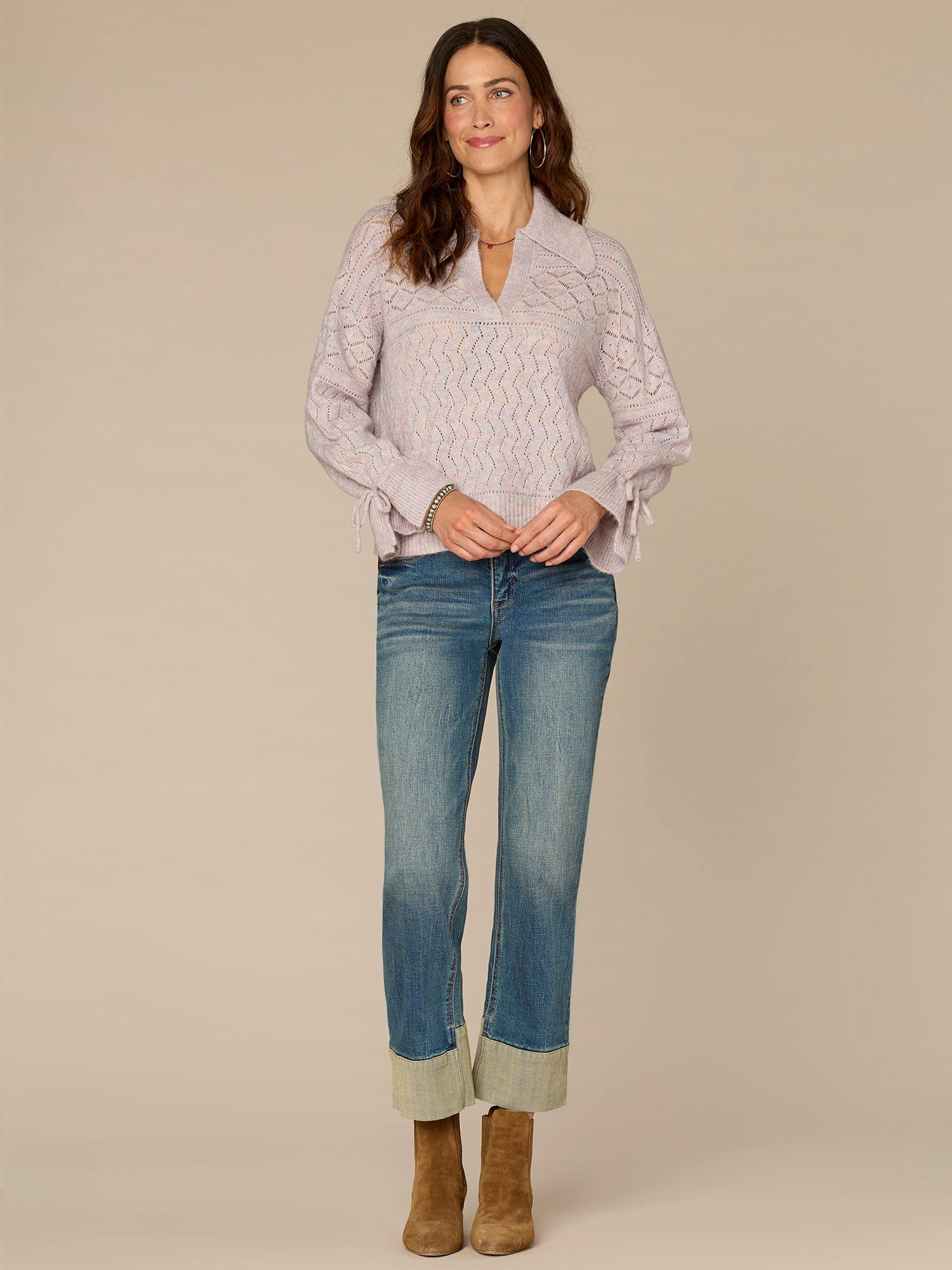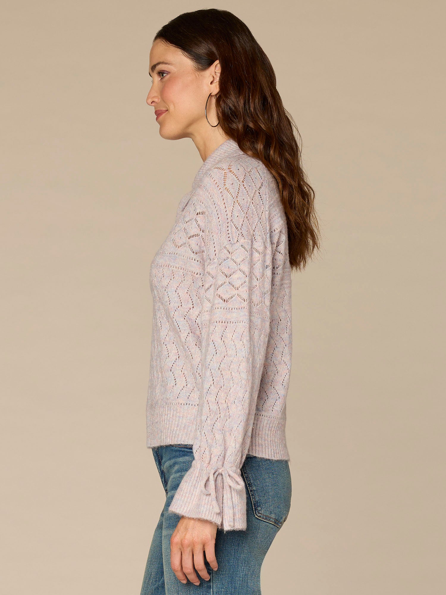 Long Flounce Sleeve V-Neck Collar Placement Pointelle Stitch Sweater