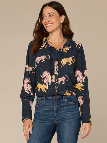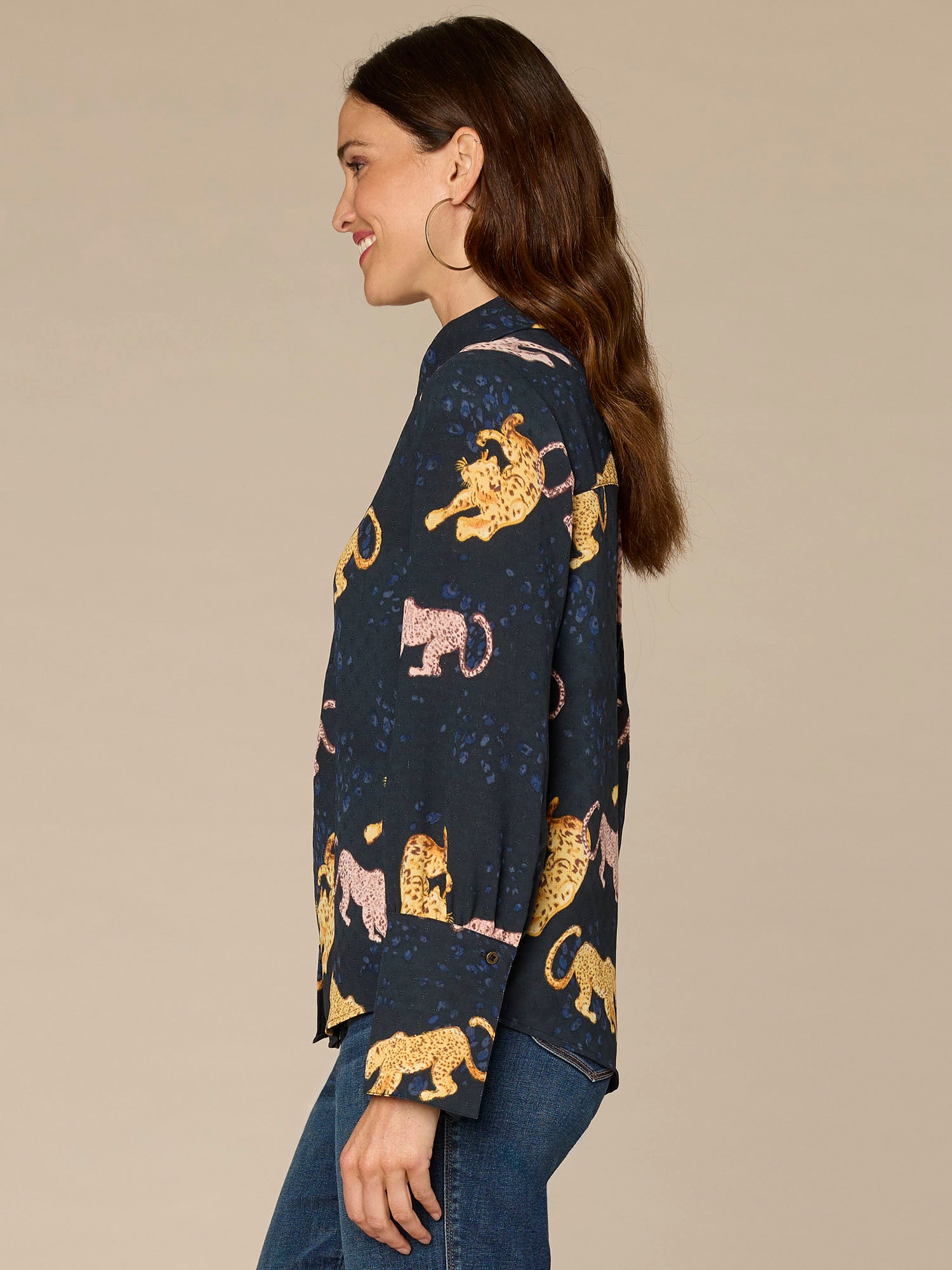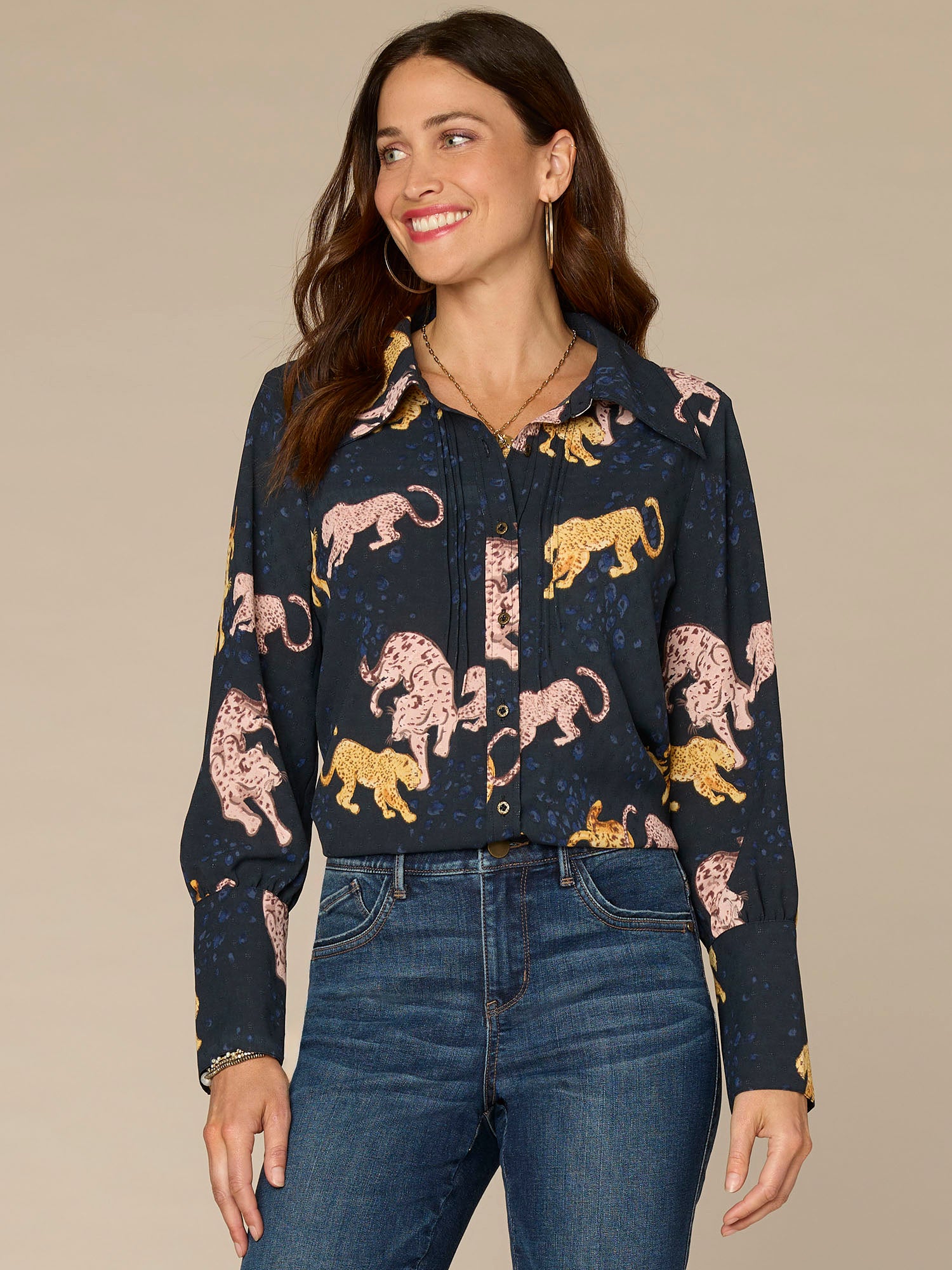 Long French Cuff Band Sleeve Button Down Animal Print Woven Top