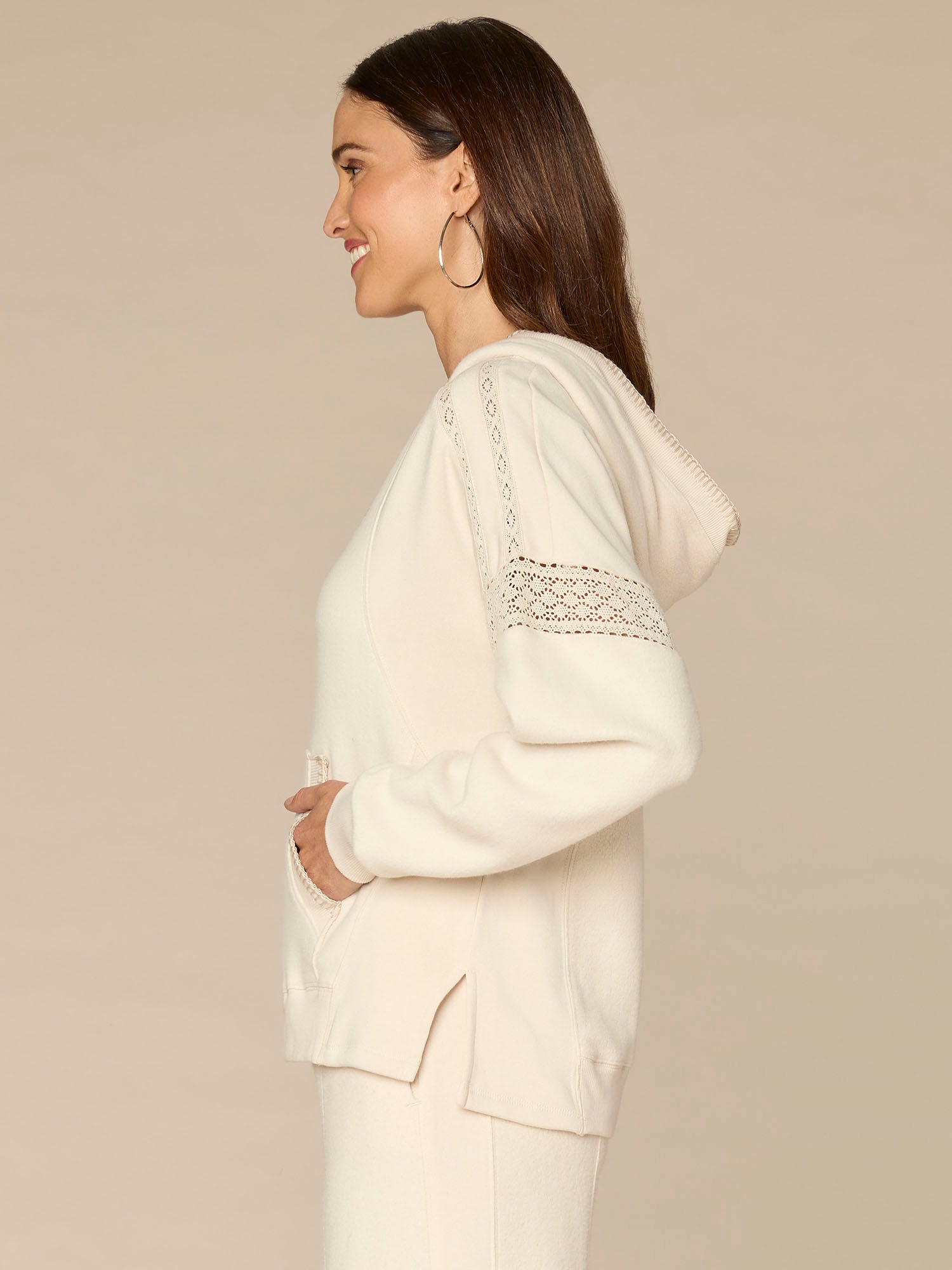 You don’t have to sacrifice comfort for style. This plus-size mixed media knit hoodie combines long crochet sleeves, a V-neck, half placket, kangaroo pocket, and blanket stitch detailing.