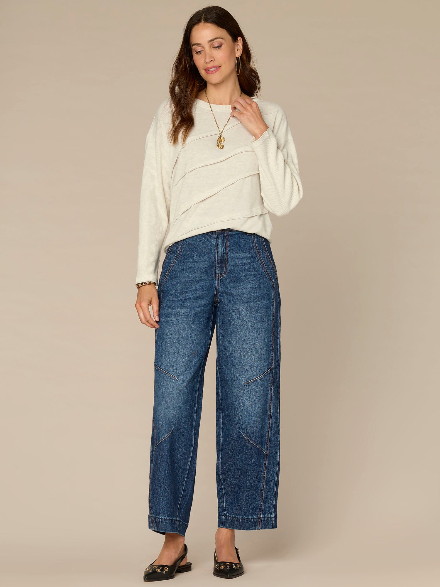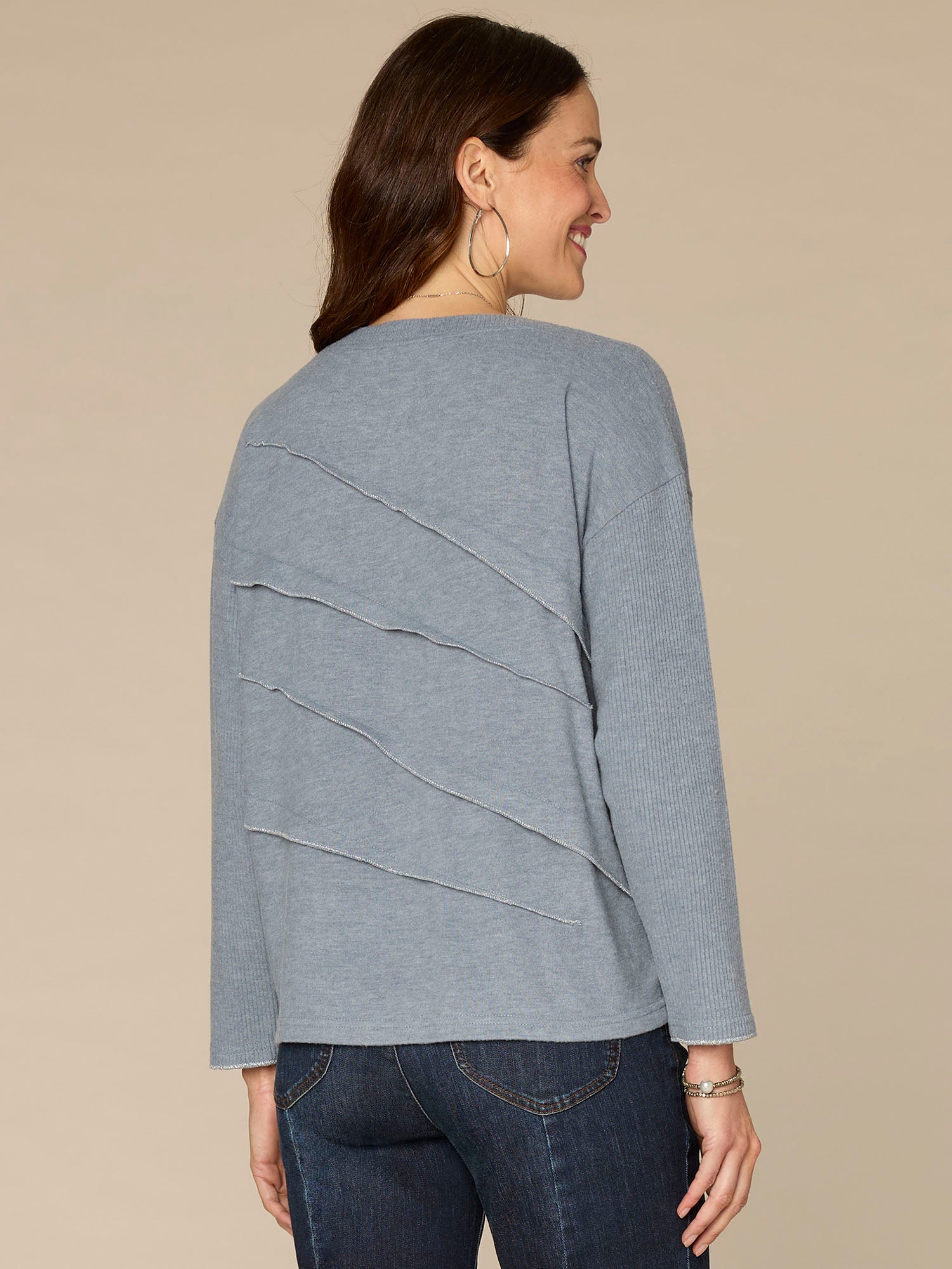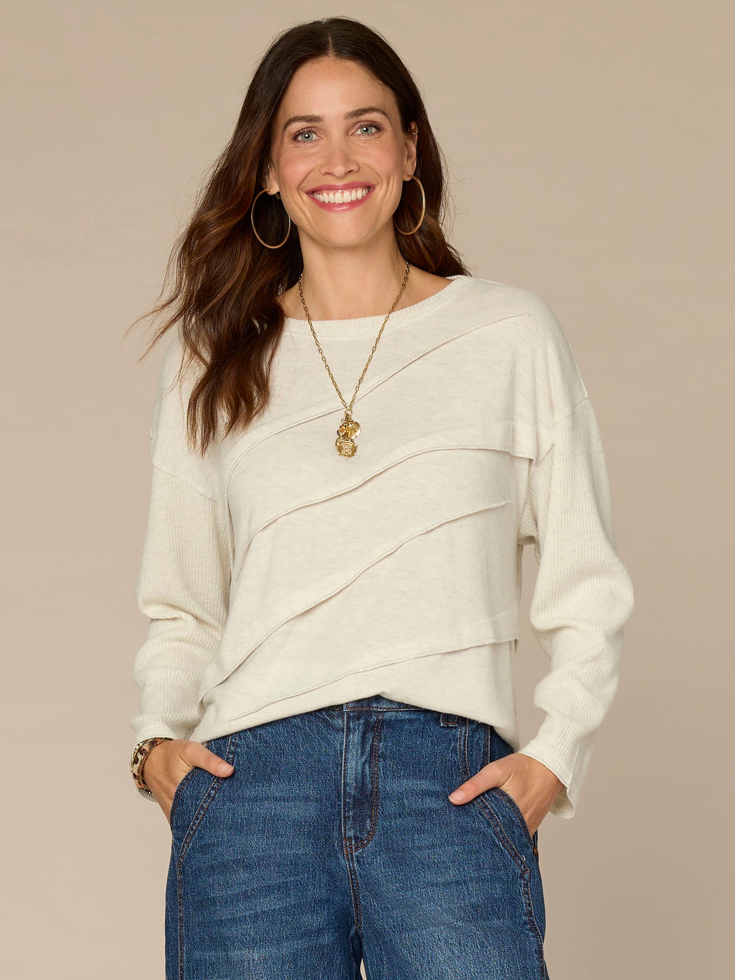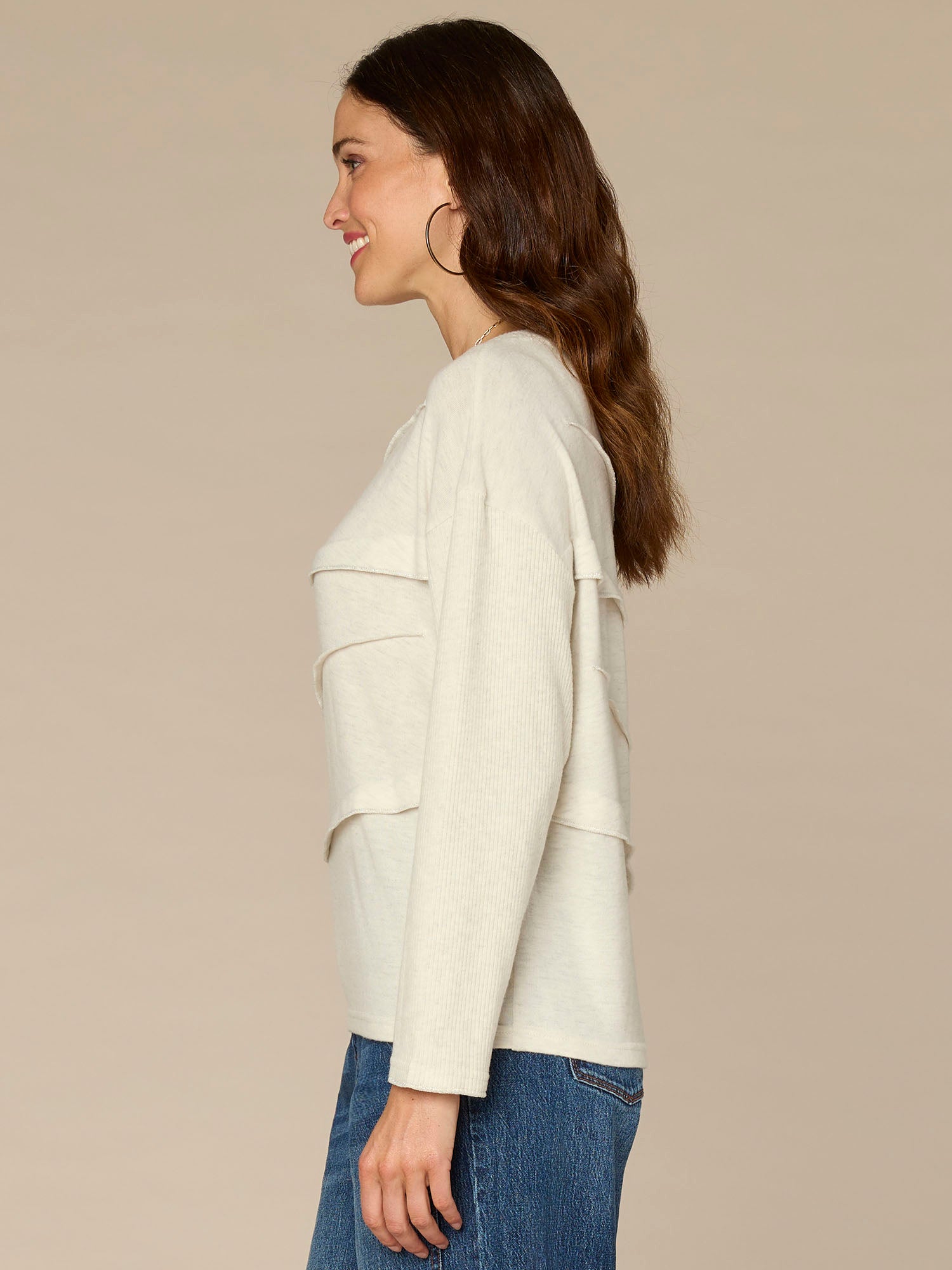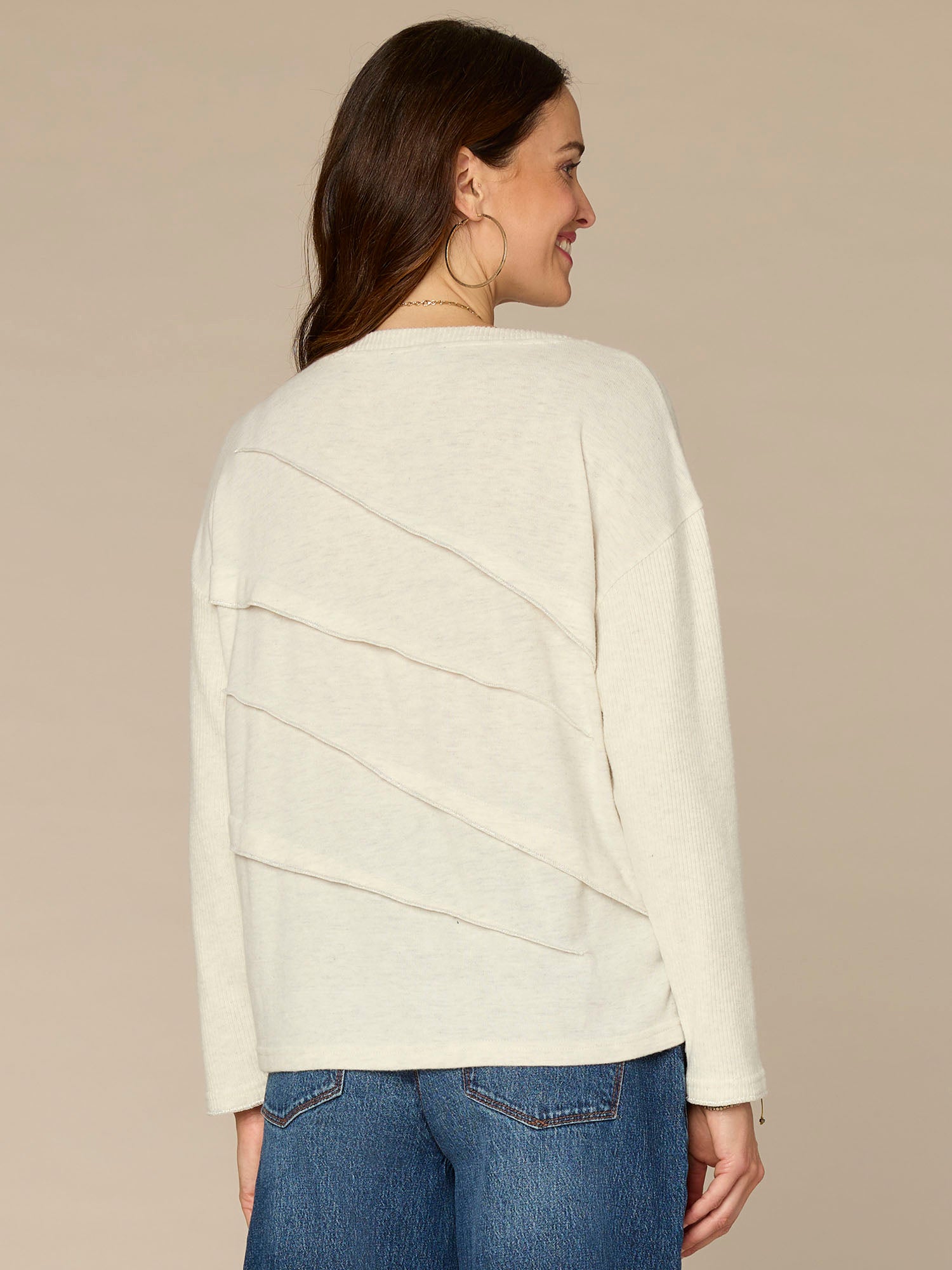 Long Sleeve Boat Neck Mixed Media Knit Top with Pleating and Overlock