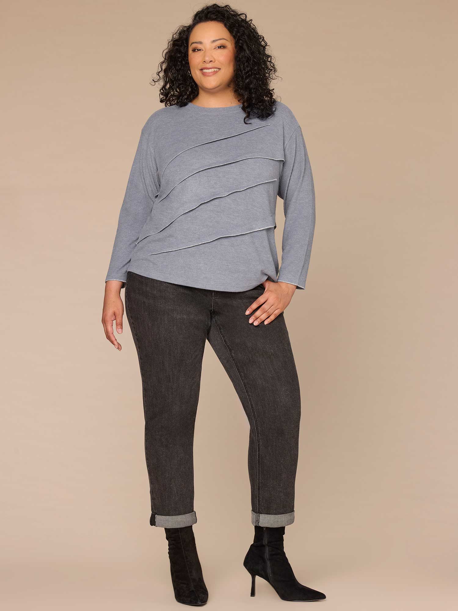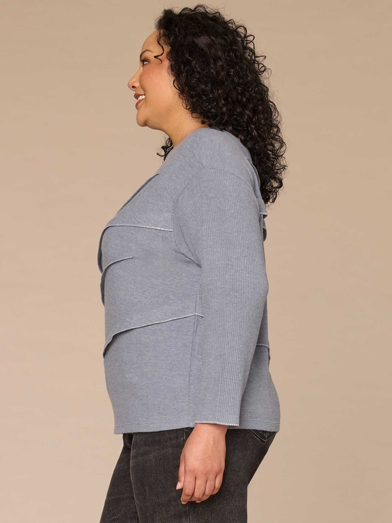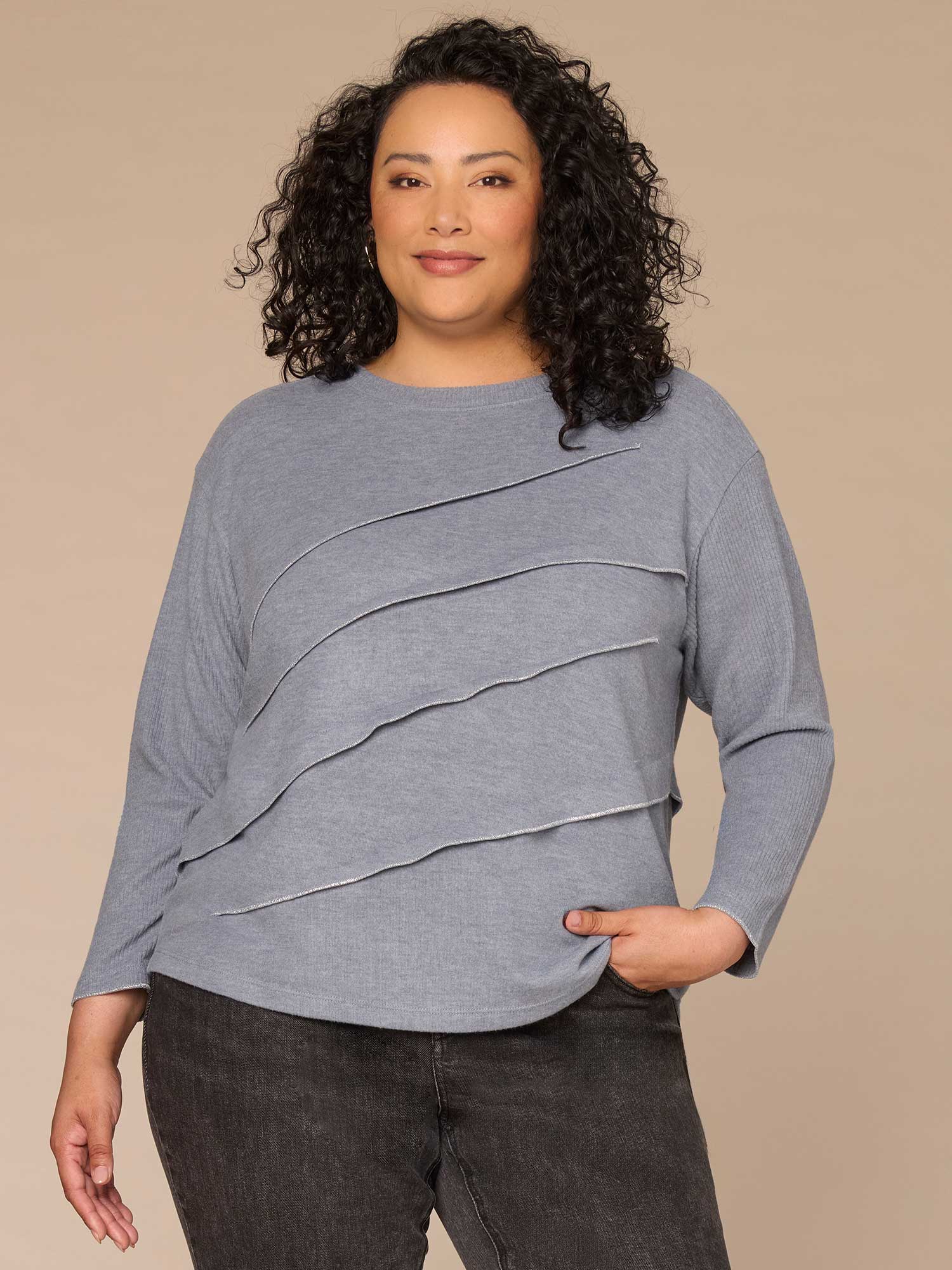 Whether you’re going out or staying in, this plus-size mixed media knit top ticks all the boxes. With long ribbed sleeves, a surplus boat neck, angled pleating, and lurex overlock detail, it’s soft, stylish, and made for effortless outfits.