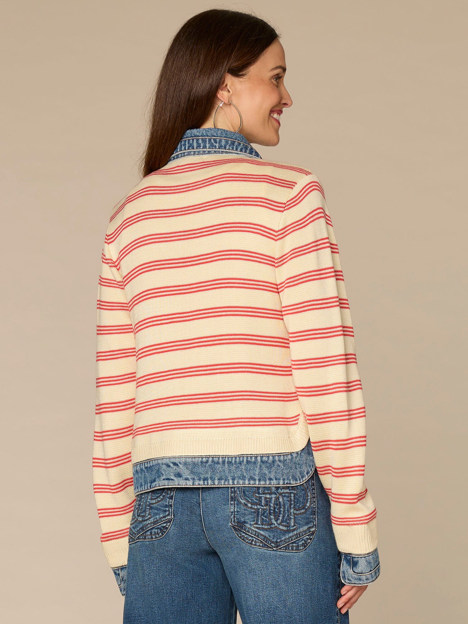 Can’t decide between a sweater and a denim jacket? Reach for this mixed media style, made with long sleeves, a button down front, curved hem, stripes, and a twofer design that strikes the balance between comfy and chic.