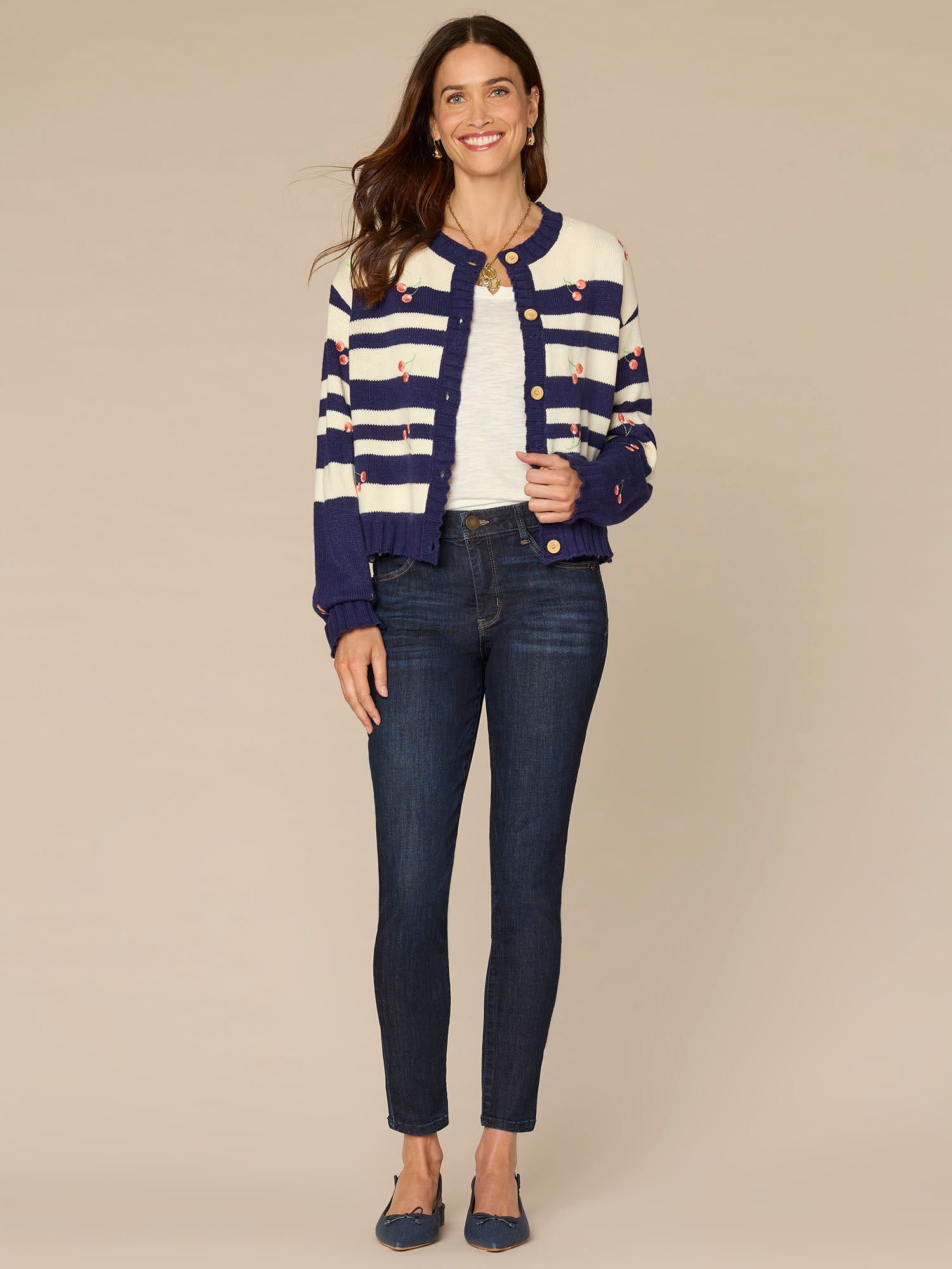 Layer up in this pretty sweater cardigan, designed with long sleeves, a round neck, button front, and placement stripes. Its embroidered cherries add a touch of feminine style to your look effortlessly.