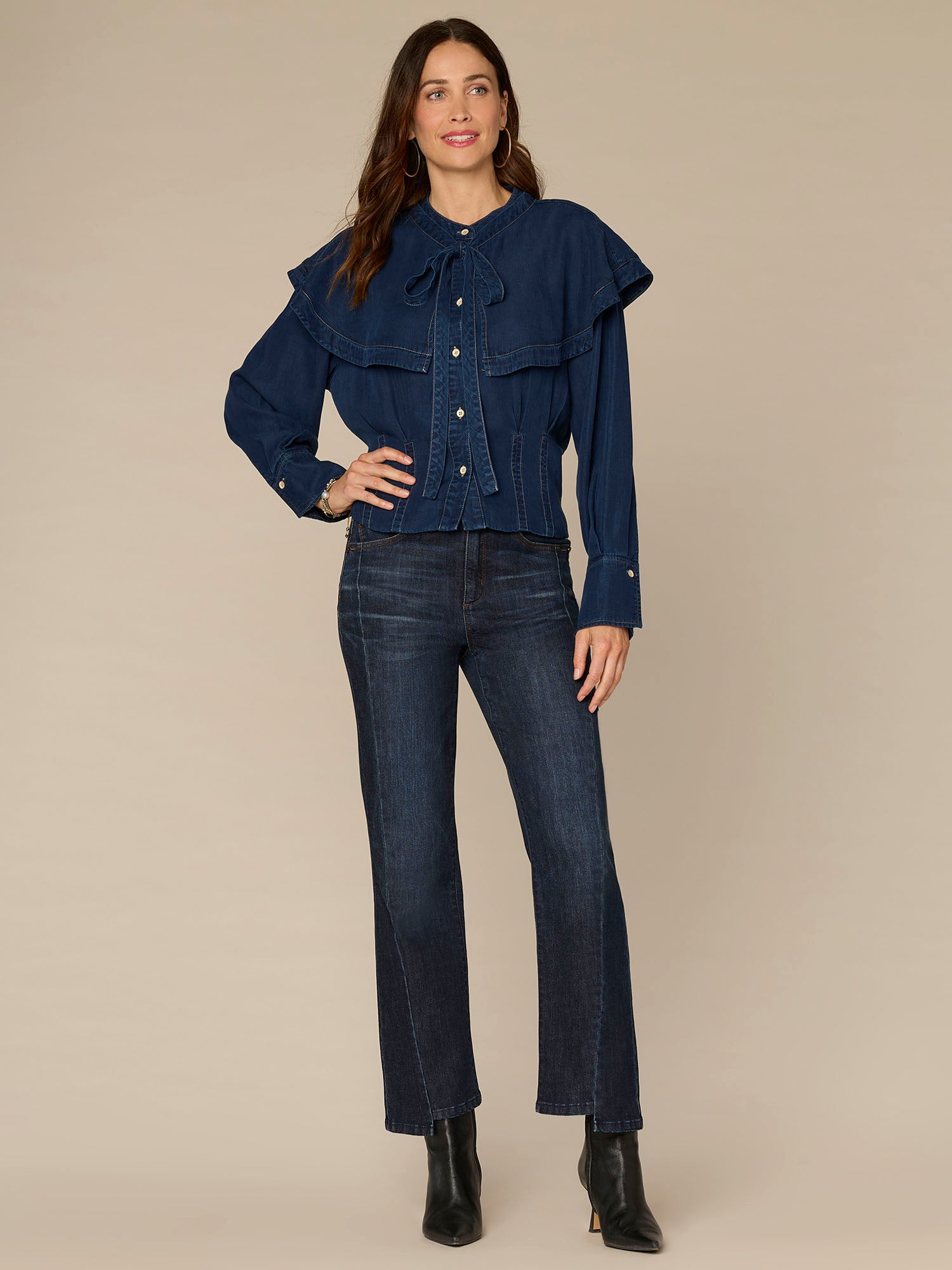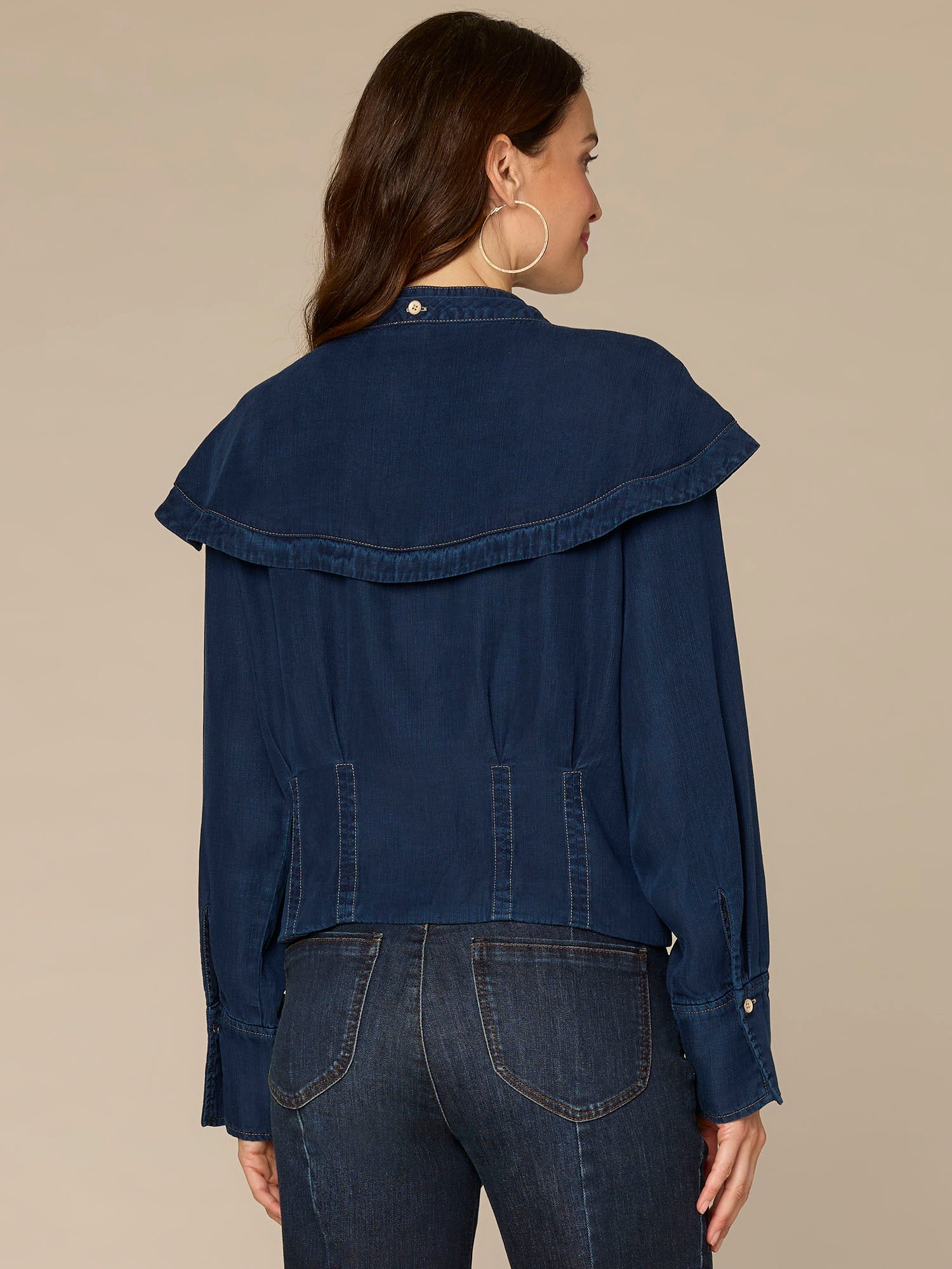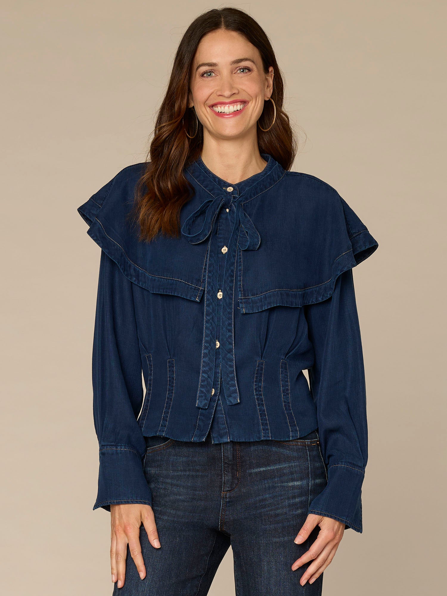 Long Sleeve Stand Collar Button Front Woven Shirt with Self Tie Cape