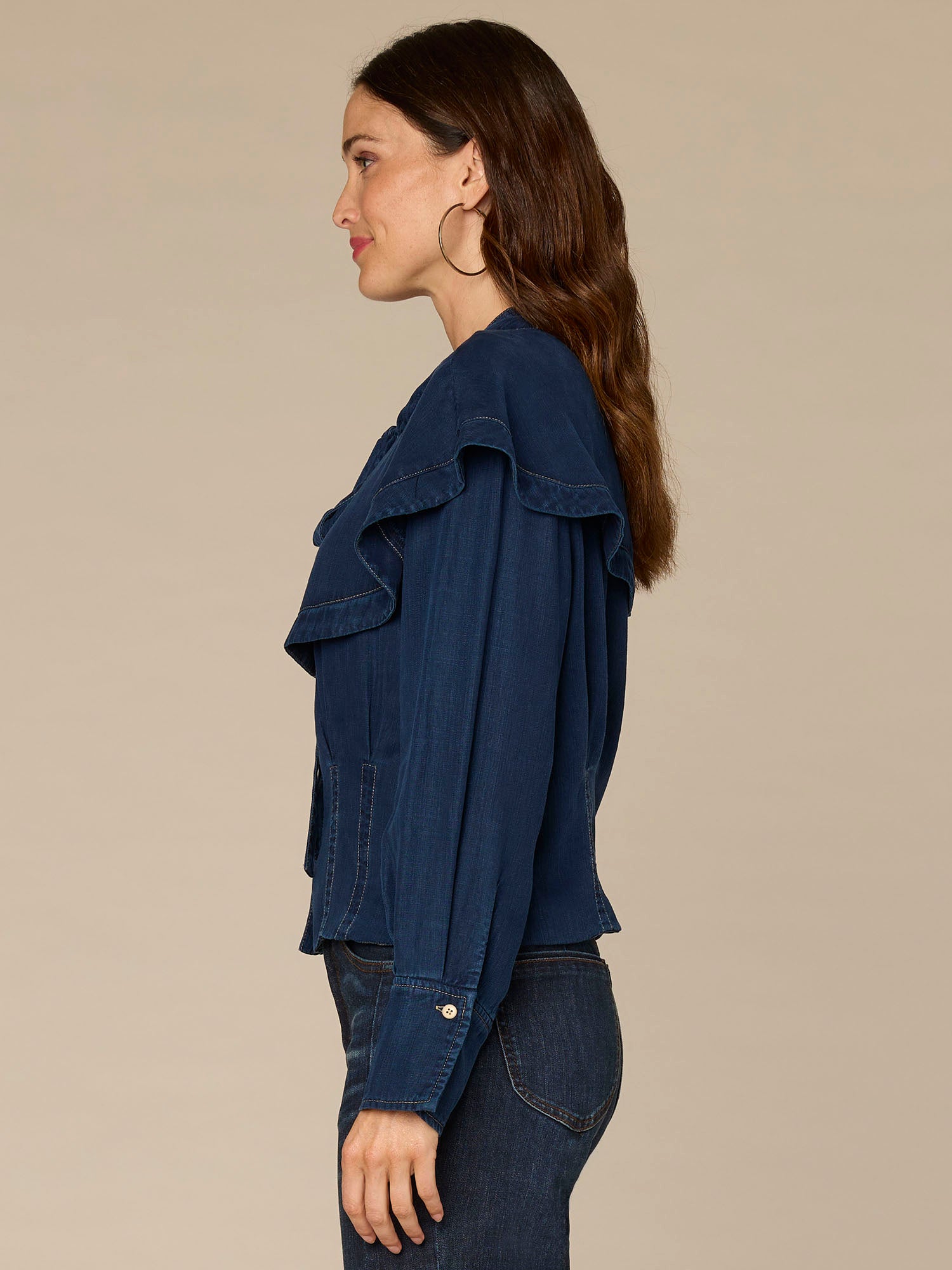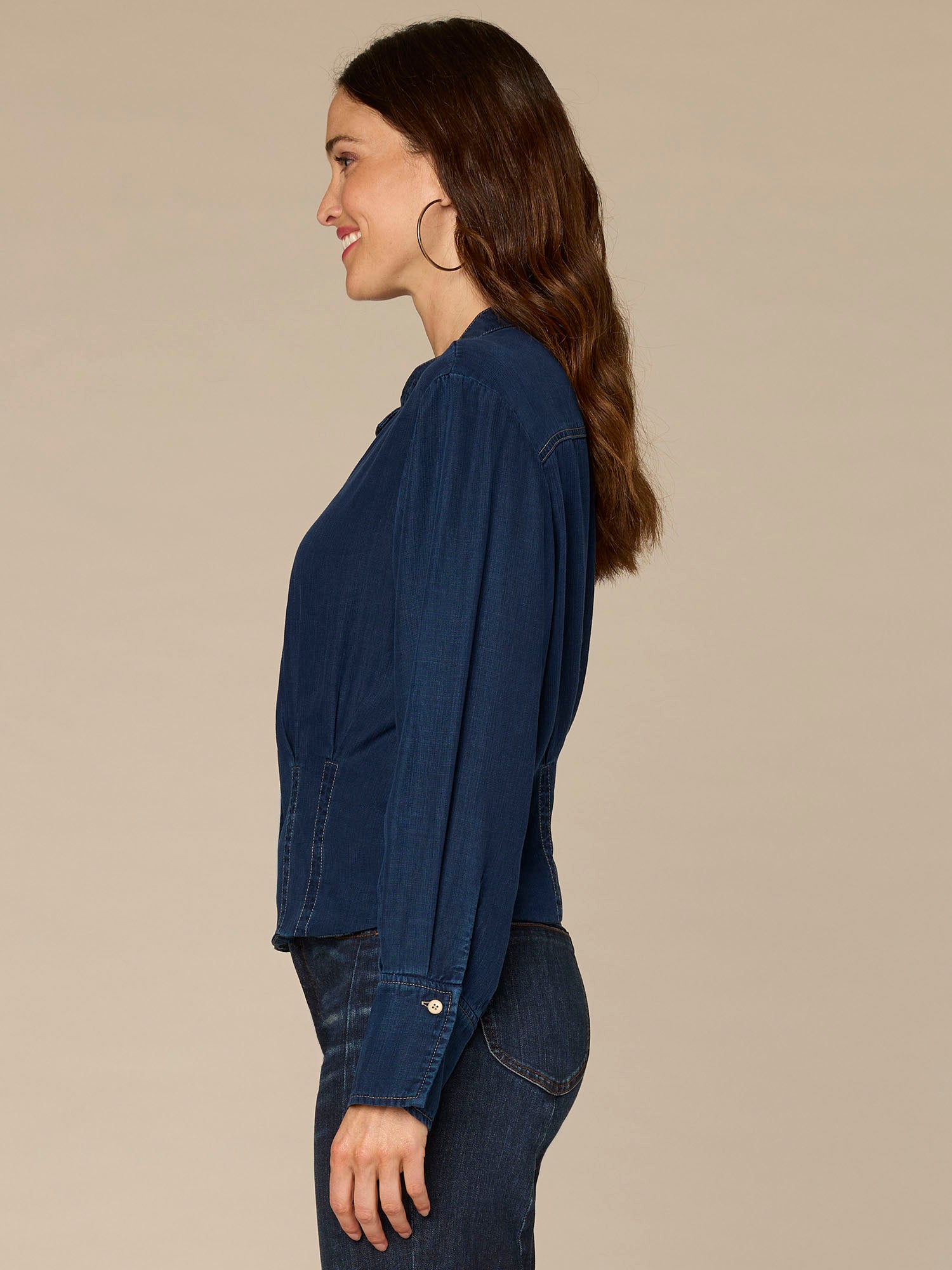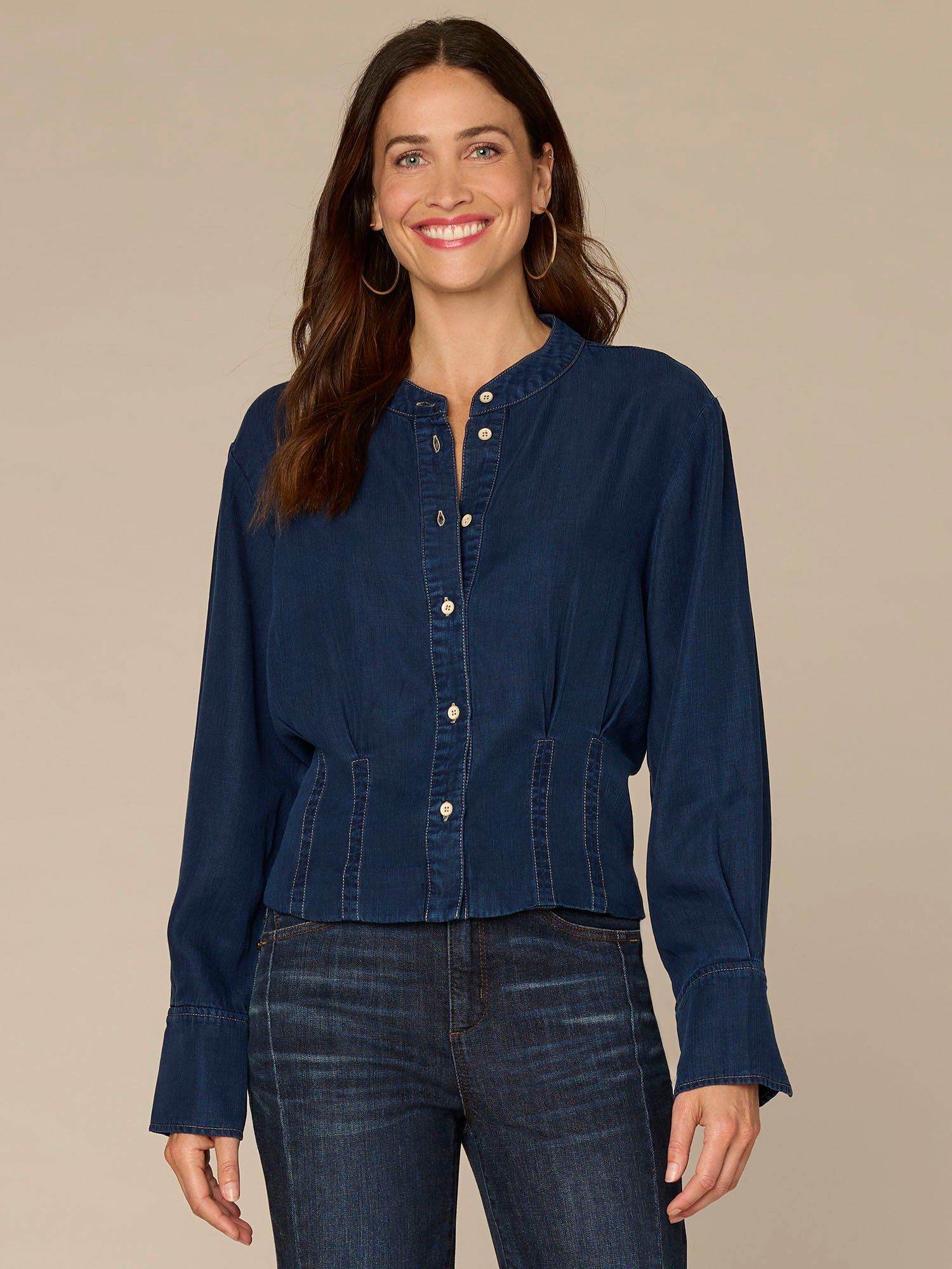 Long Sleeve Stand Collar Button Front Woven Shirt with Self Tie Cape