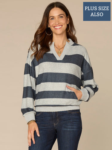 Long Sleeve V-Notch Striped Plus Size Knit Top with Kangaroo Pocket
