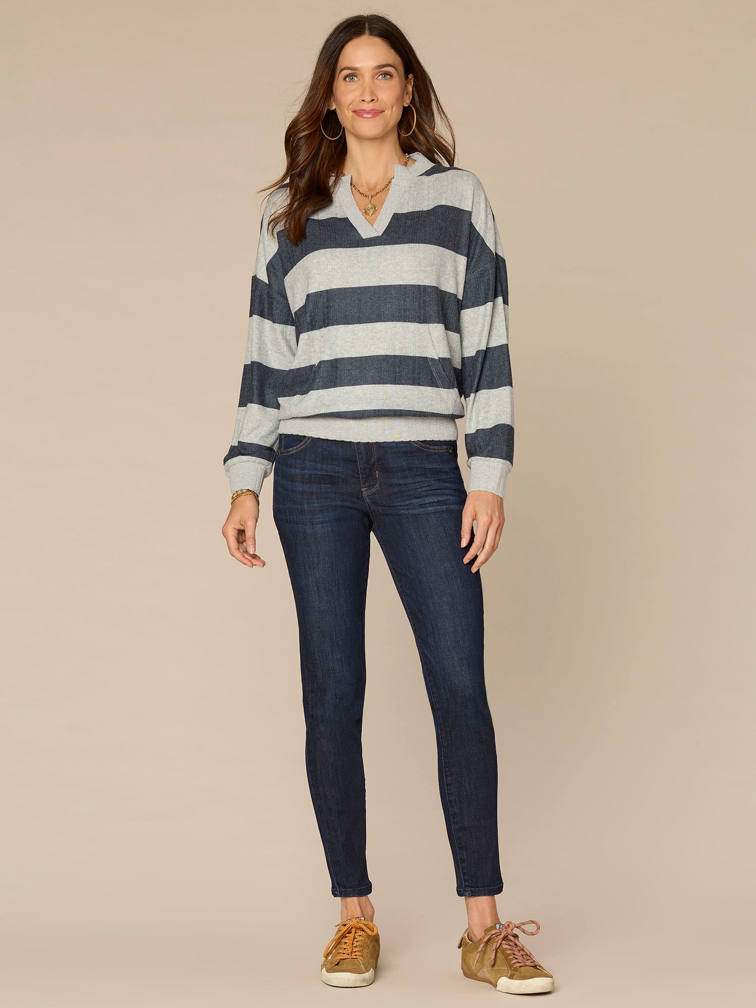 Stripes are always in, and this plus-size knit top’s design details sweeten the deal. Featuring long raglan sleeves, a V-notch neck, kangaroo pocket, and scalloped rib contrast detailing, it’s a cozy style you’ll reach for on repeat.