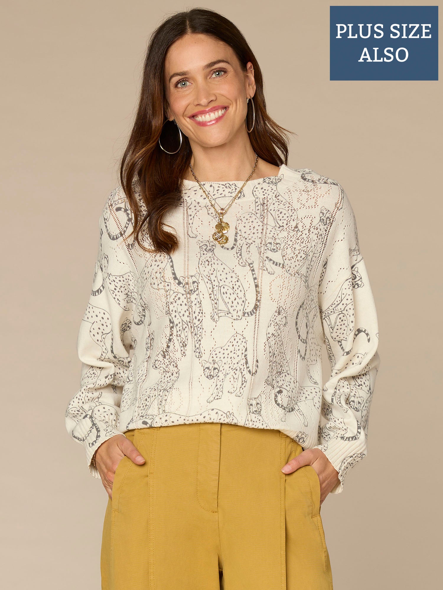 This light pullover sweater in plus sizing suits all occasions, whether you pair it with your favorite jeans or elevated trousers. It has long straight sleeves, a ribbed boat neck, animal print, and an open work design that looks great layered over a tank top.