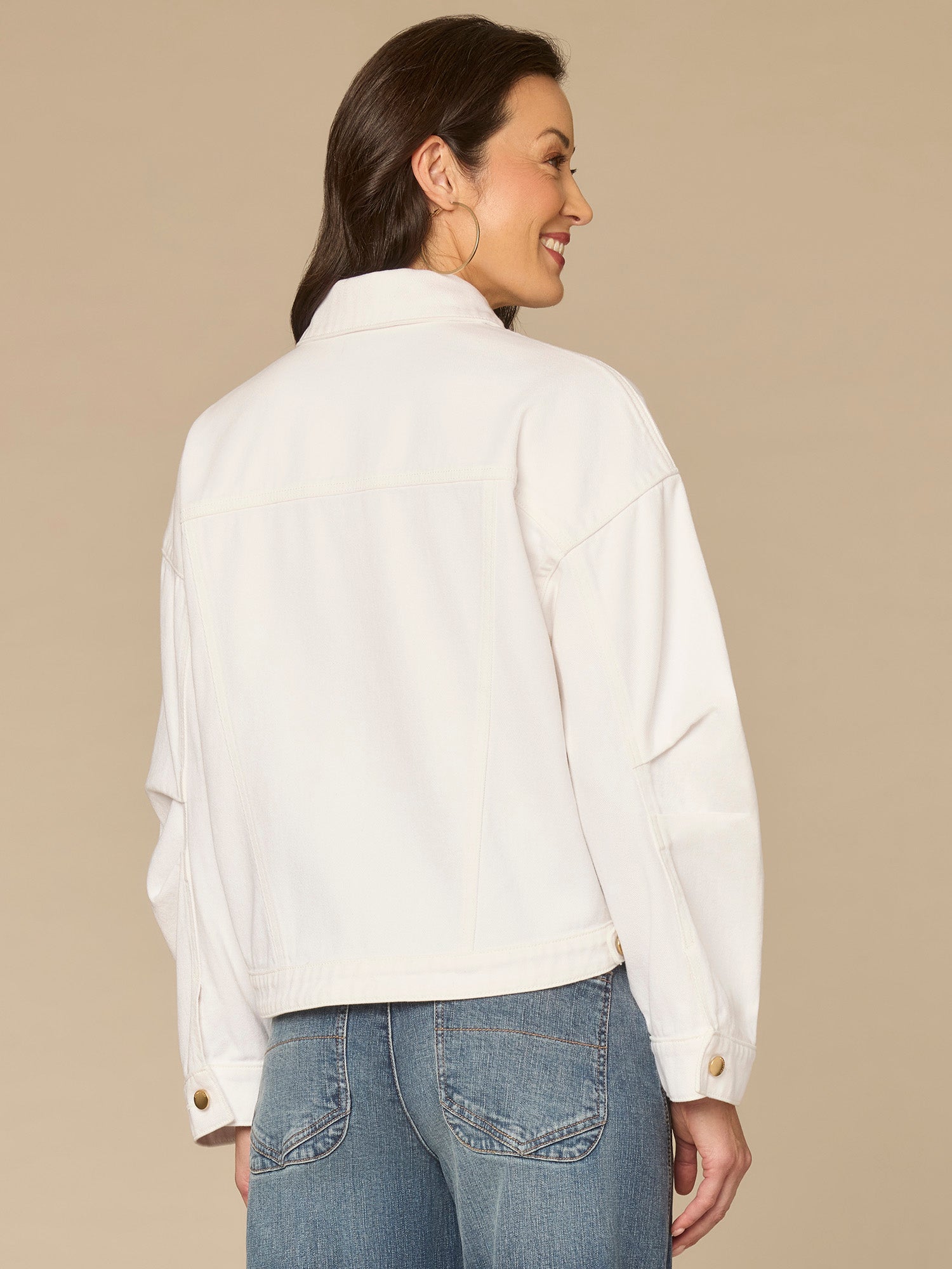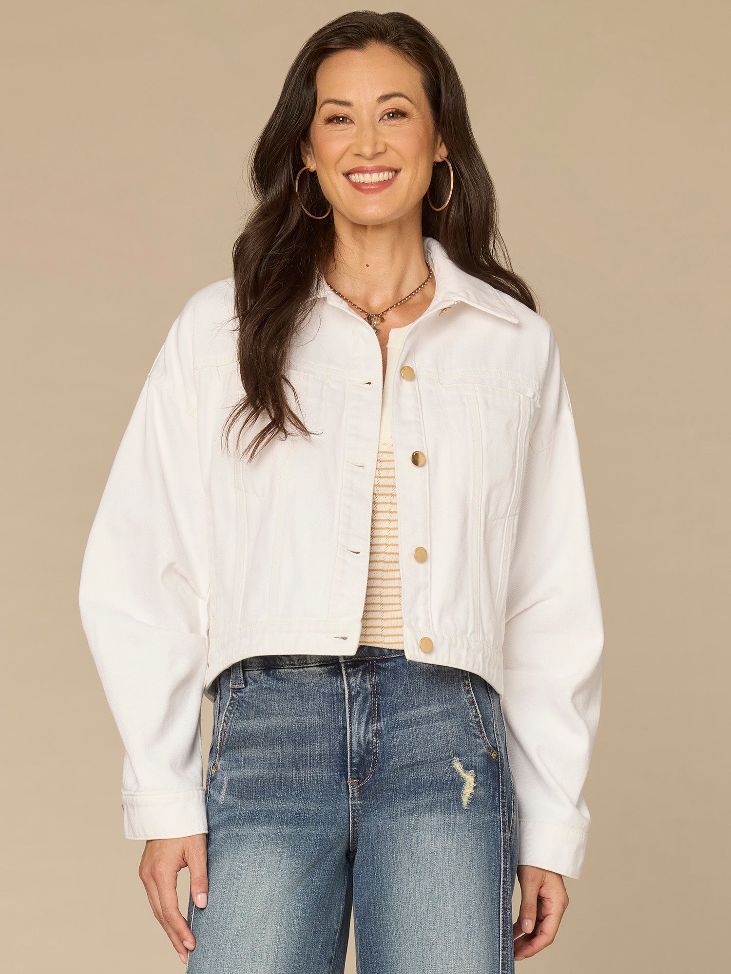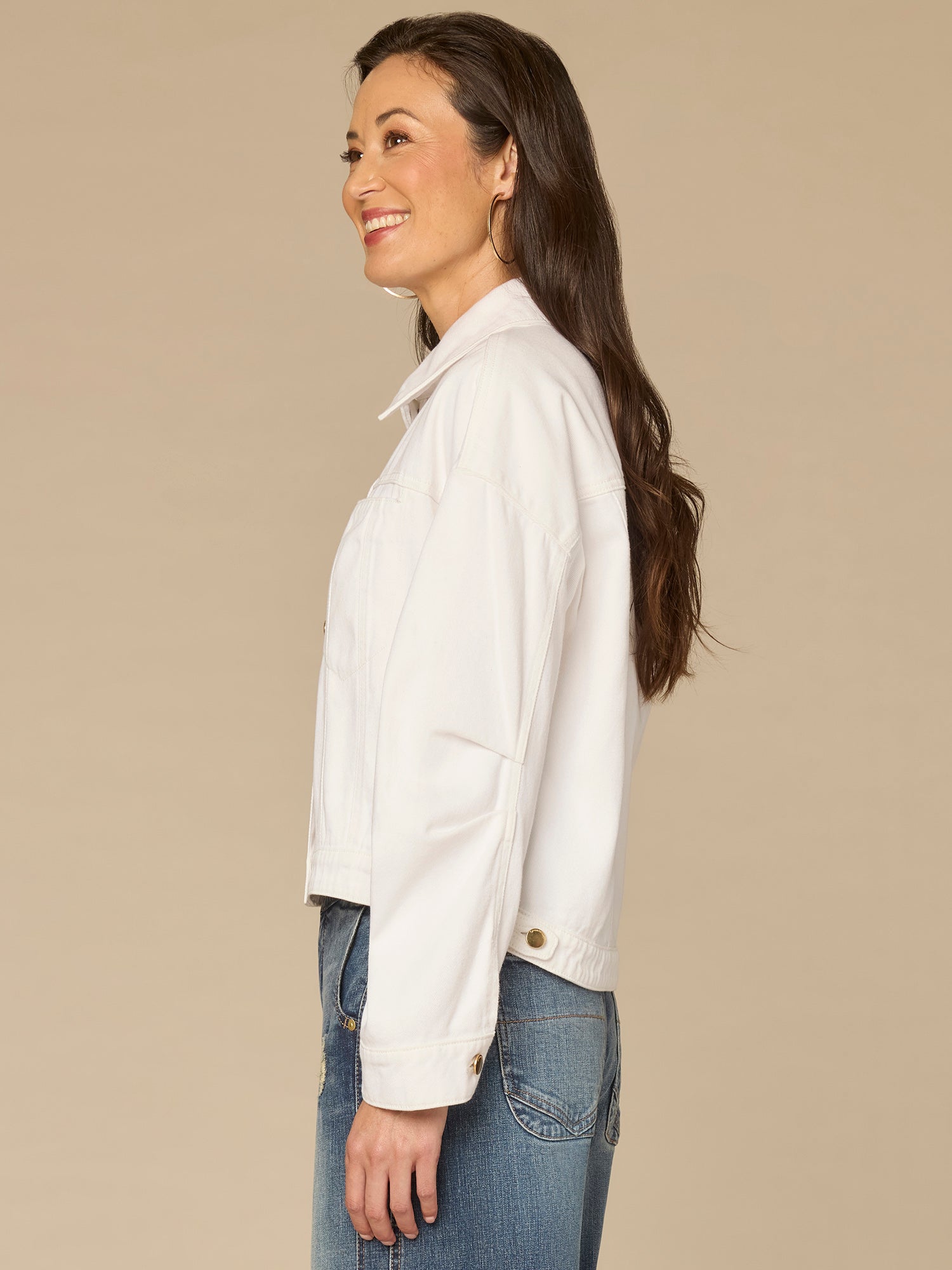 You can’t go wrong with a classic denim jacket. This optic white one in petite sizing is designed with long oversized barrel sleeves, a collar neck, button down front, welt pockets, and a hi-low hem.