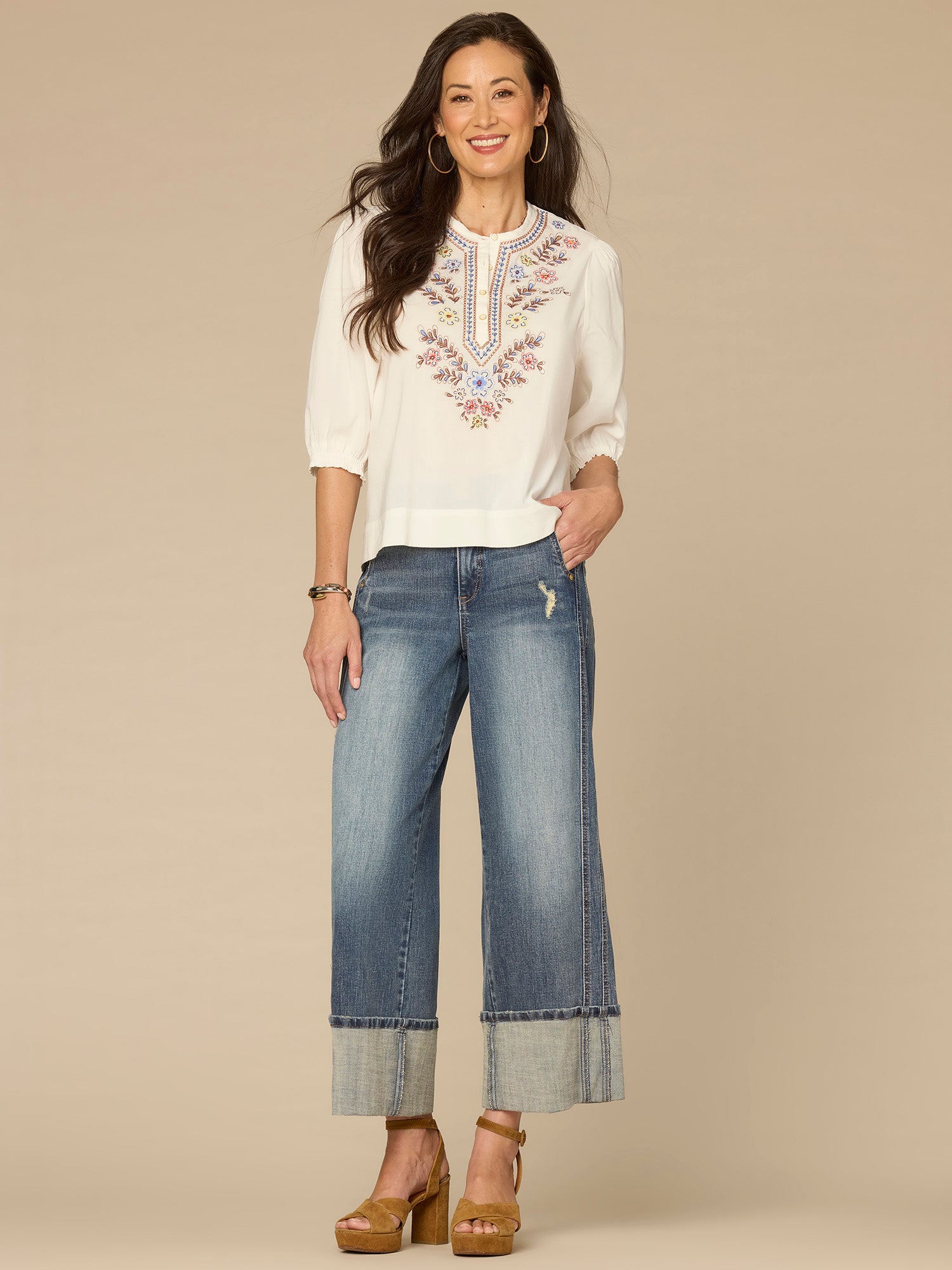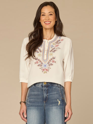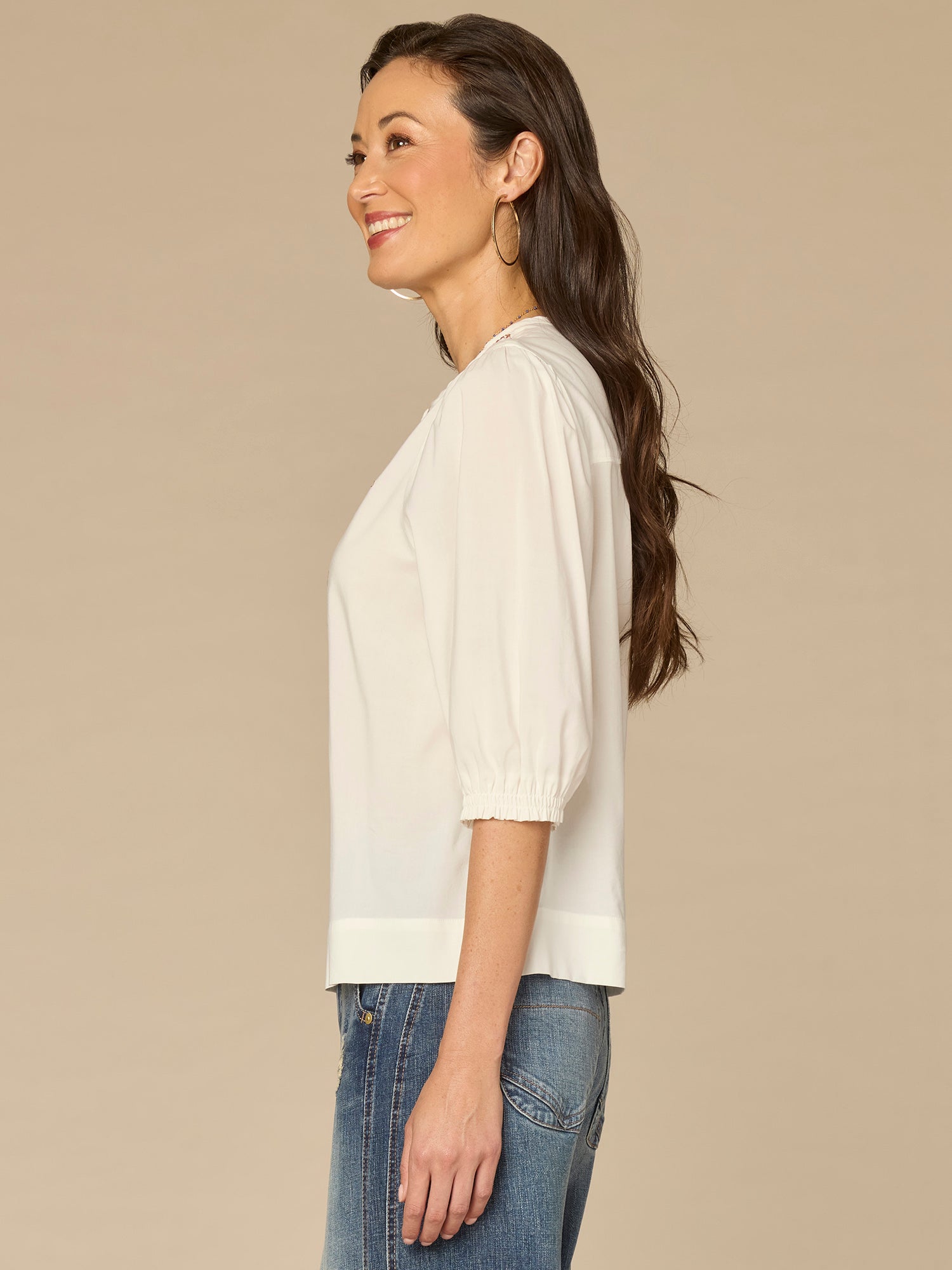 Pleated Blouson Sleeve Round Neck Embroidered Placket Woven Top