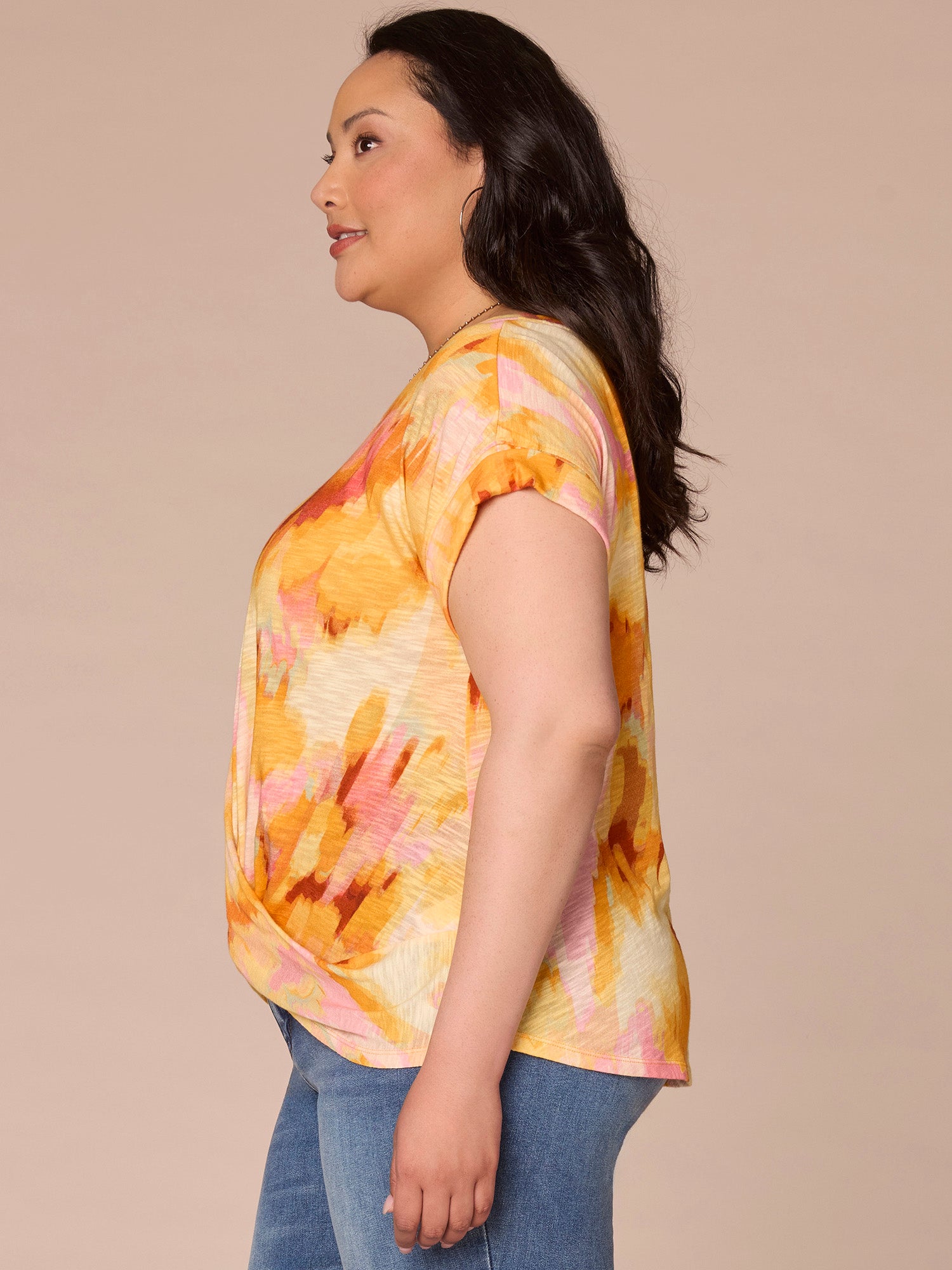 Turn up the brightness in this plus-size twist-front knit tee, made for effortless styling and confidence. The short roll cuff sleeves, scoop neck, and abstract tie-dye print bring playful energy to your everyday.