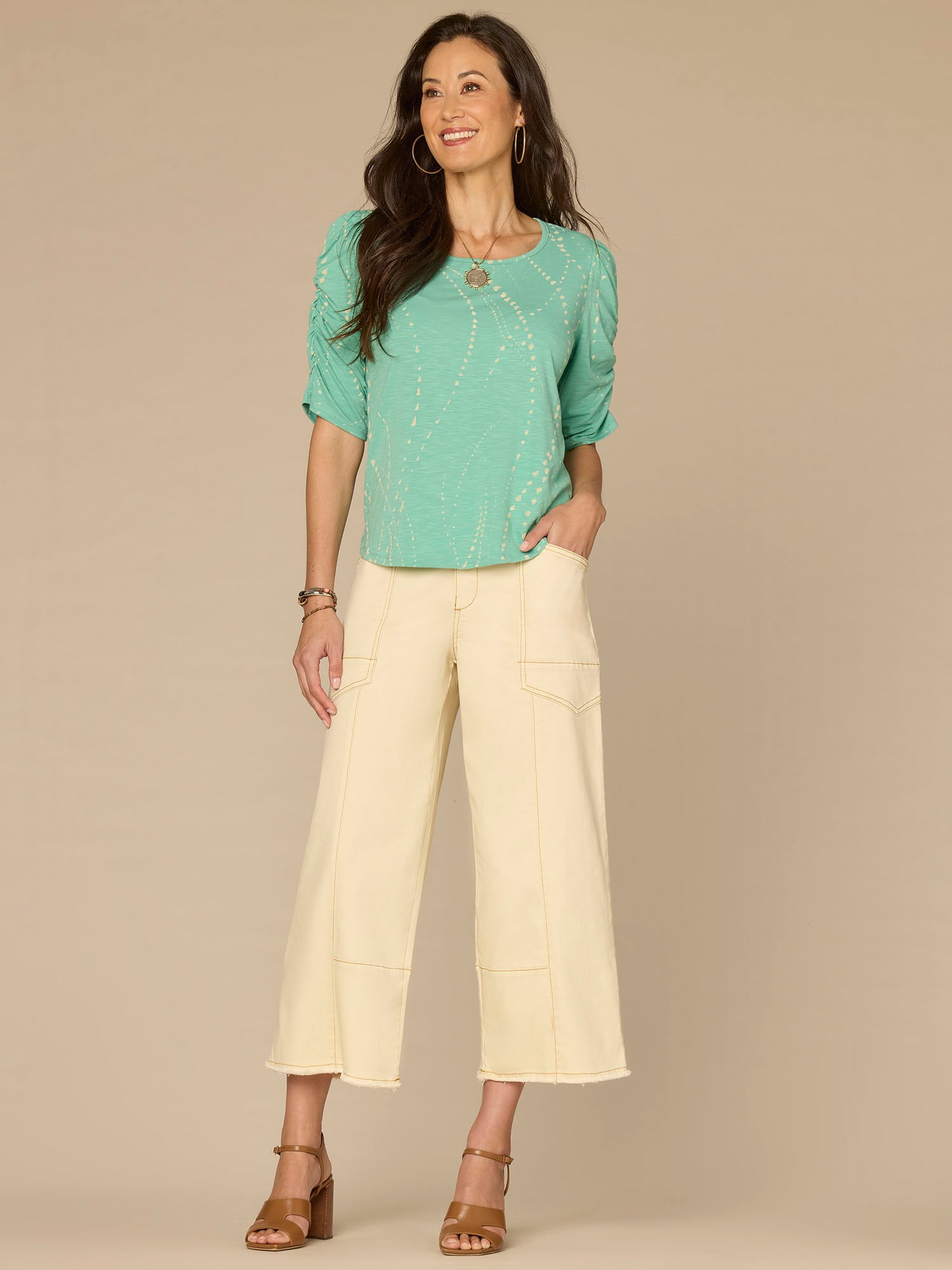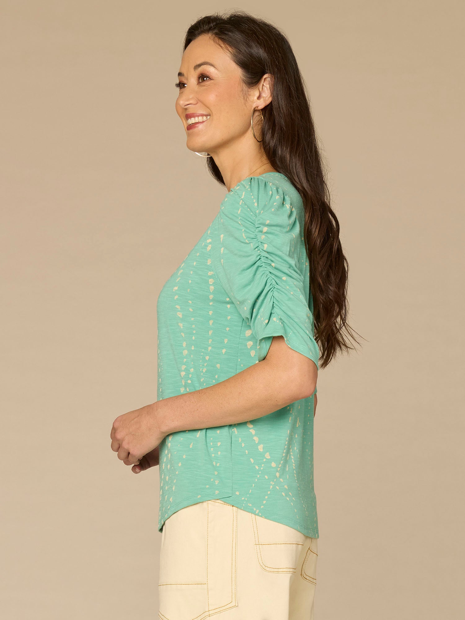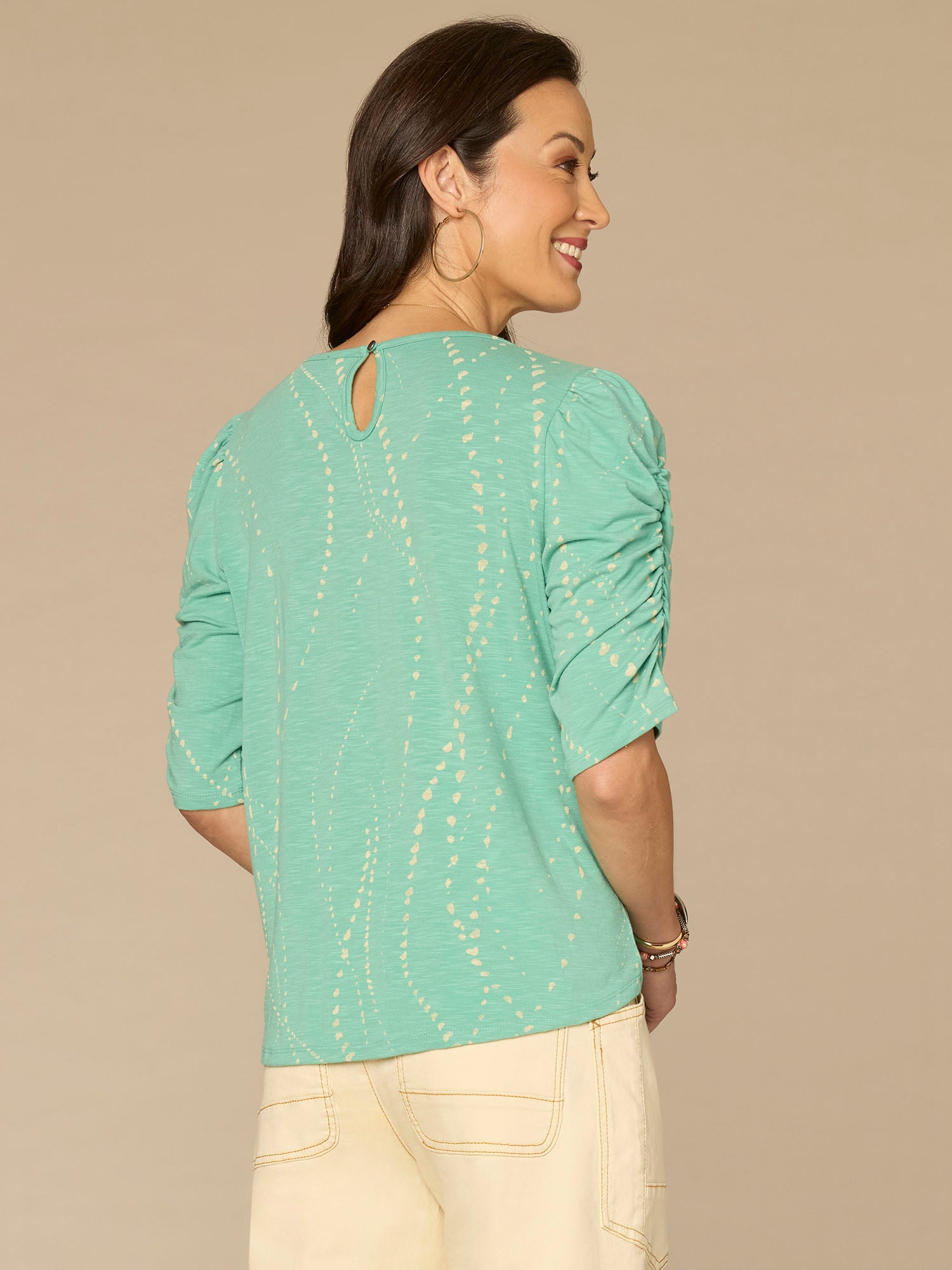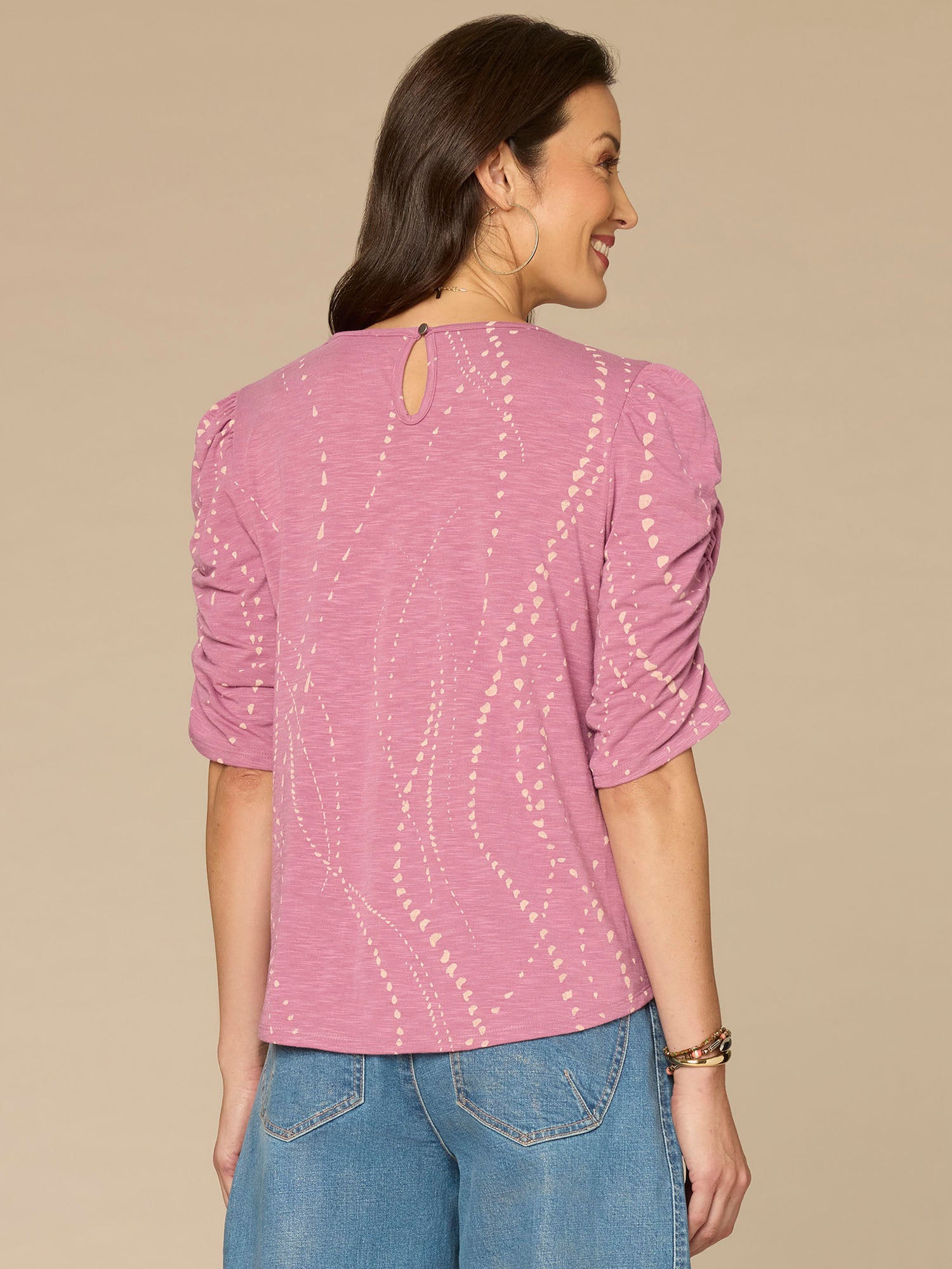 Ruched Elbow Sleeve Scoop Neck Dotted Print Keyhole Petite Knit Top
