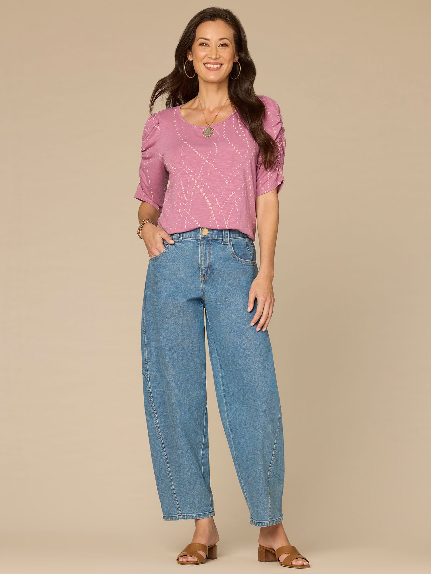 Once you try this abstract dotted print knit top in petite sizing, you’ll want one in every color! It has chic elbow ruched puff sleeves, a scoop neck, back keyhole, and a surplus hem.