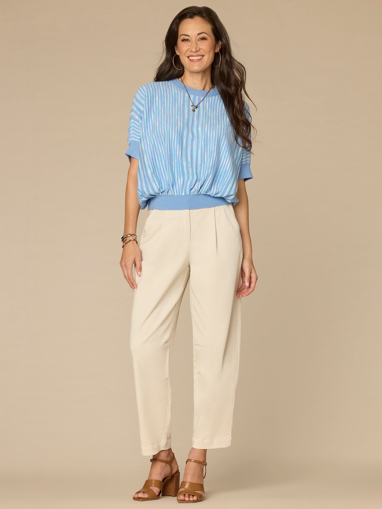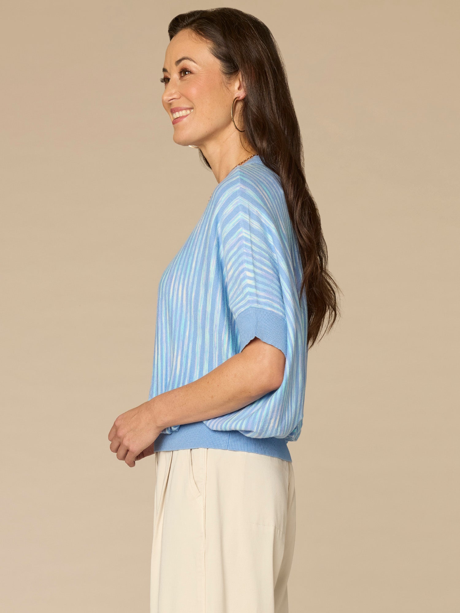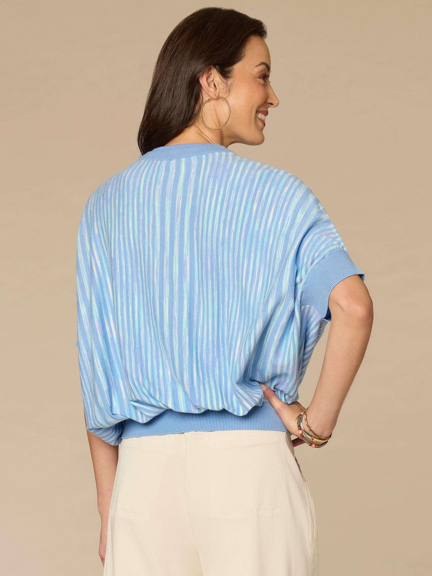 Elevate your sweater collection with this vibrant space dye style. It’s designed with short banded dolman sleeves, a double round neck, and flattering vertical stripes.