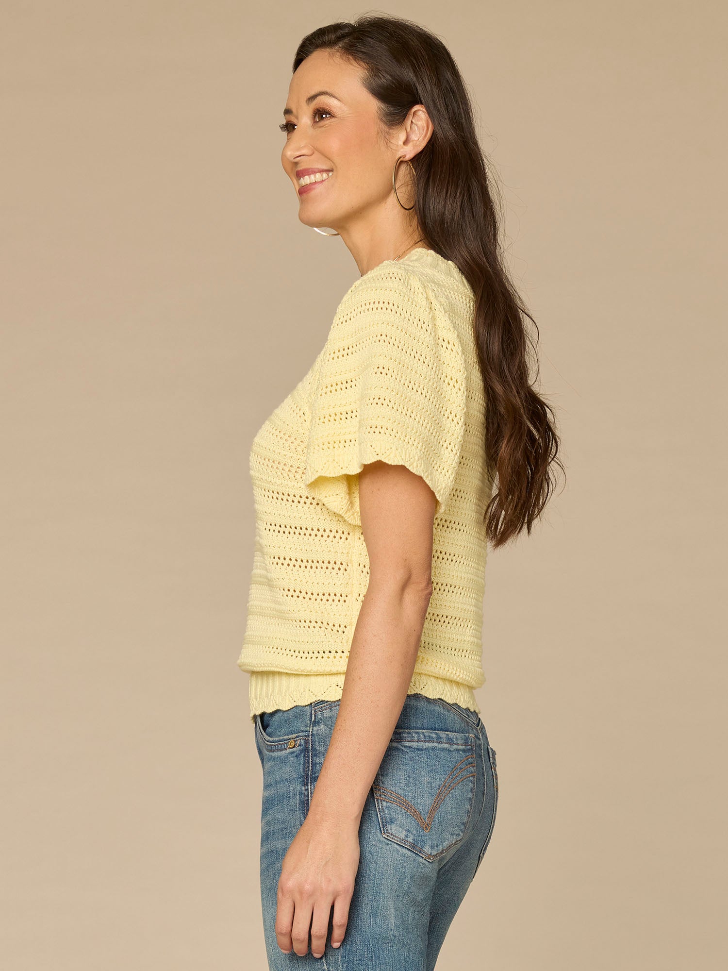 Short Flutter Sleeve Round Neck Crochet Yoke Scallop Edge Sweater