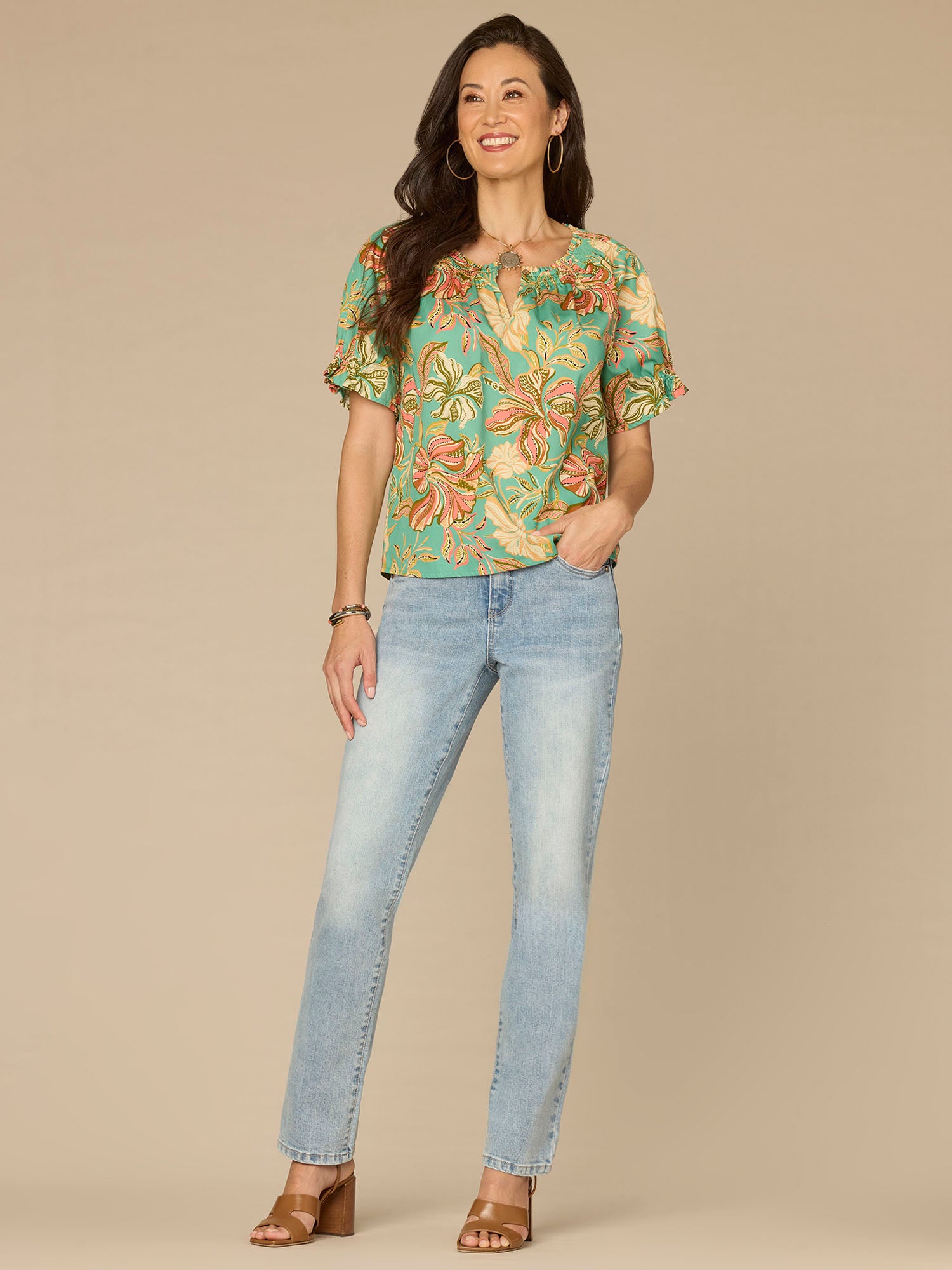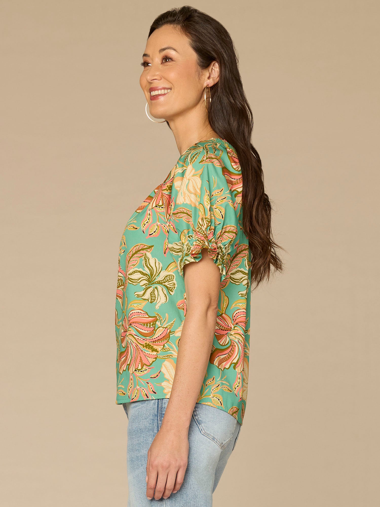 Meet the floral printed woven top that makes every day feel like a garden party. Featuring short half smock sleeves, a smocked ruffle edge round neck, and a keyhole button, it’s effortlessly chic and always in style.
