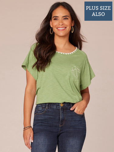 Lowkey days call for this knit boyfriend tee in plus sizing. Designed with short sleeves and a flattering scoop neck, it’s finished with delicate embroidery along the neckline and graphic pocket for a stylish twist on your everyday essential.