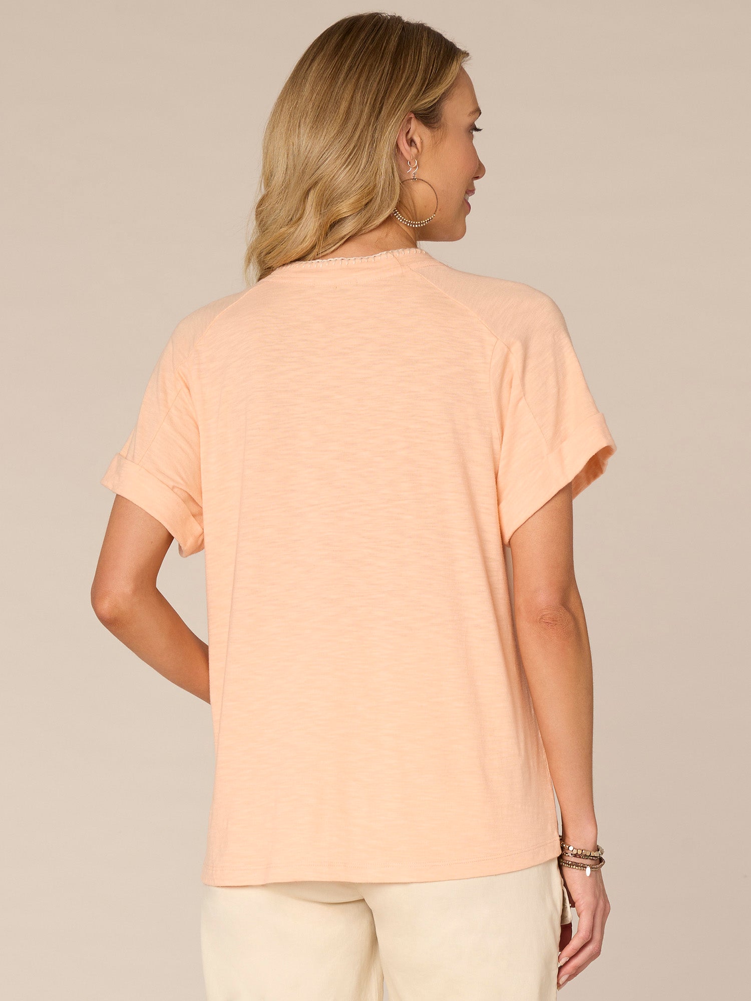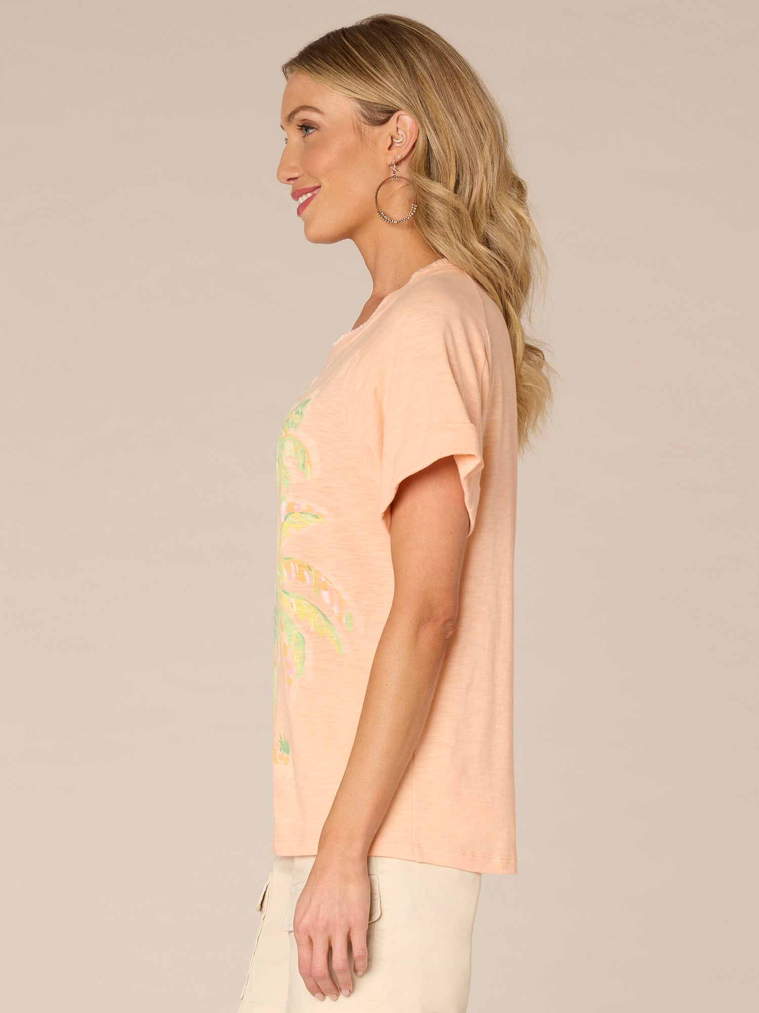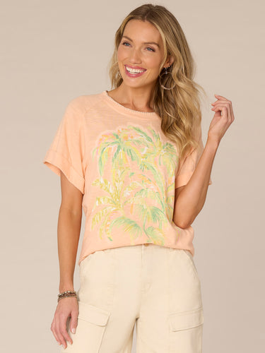 Made to stand out in sweet sherbet tones, this screen-printed knit boyfriend tee brings vacation energy with palm tree artwork and delicate embroidery. Short roll cuff sleeves and a scoop neck give it casual look you can wear on repeat.