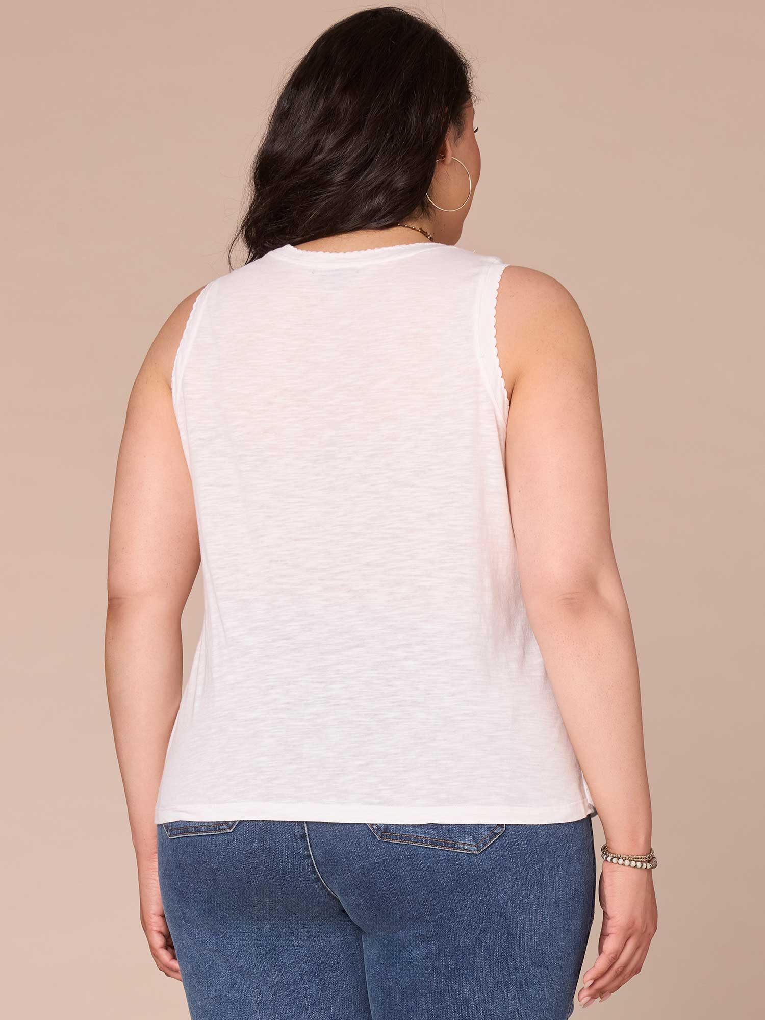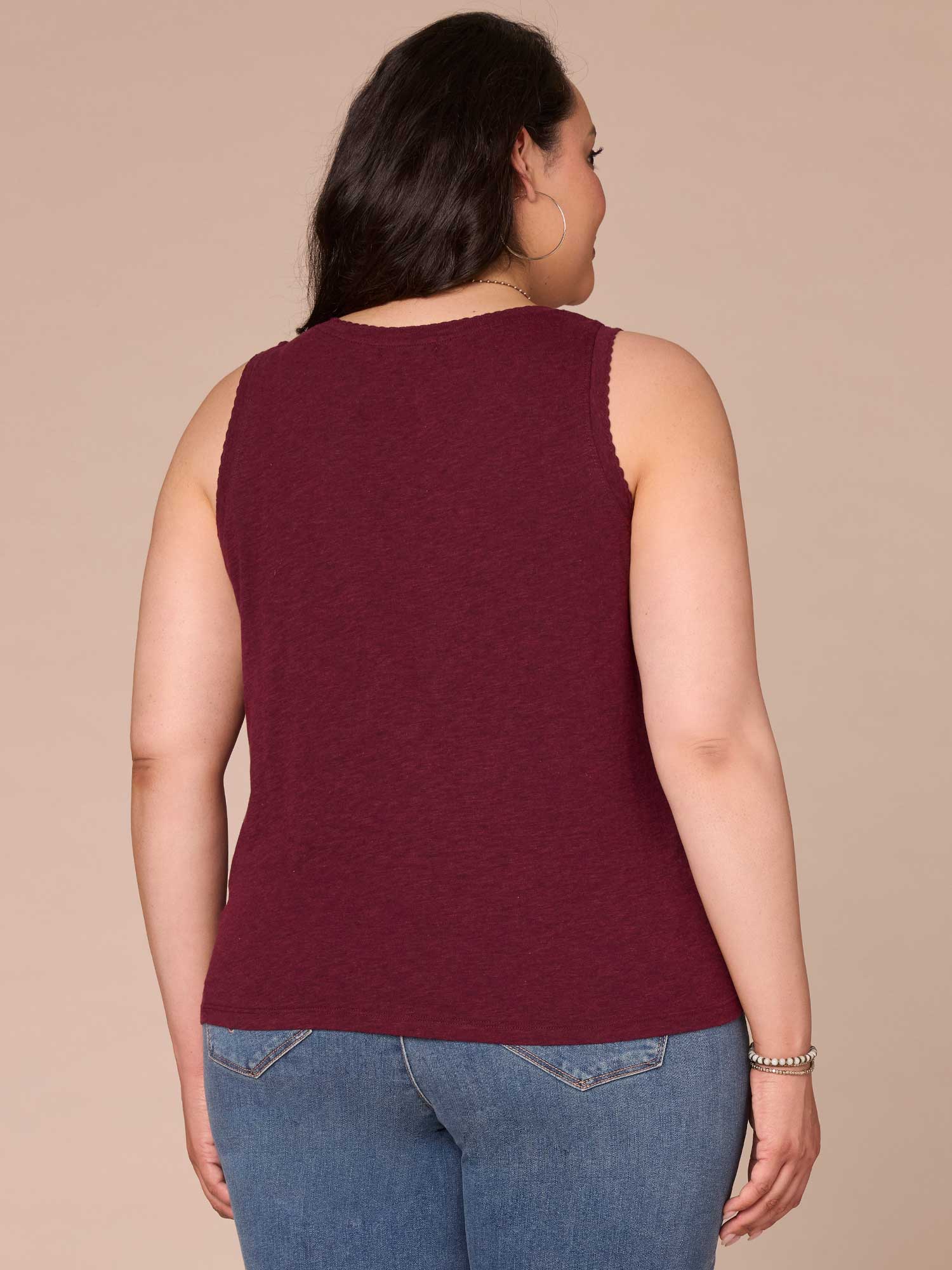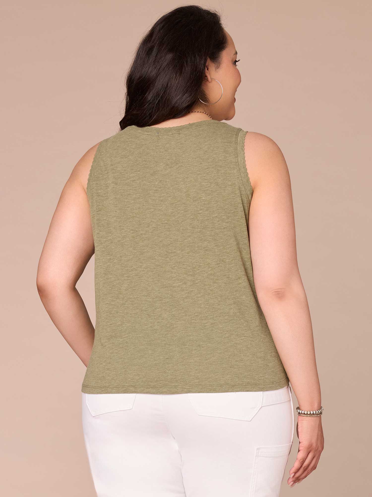 Wear this knit tank top in plus sizing on its own or underneath a jacket for a put-together, layered look. It has a sweetheart neckline, shell tuck embroidery, and a shirttail hem.