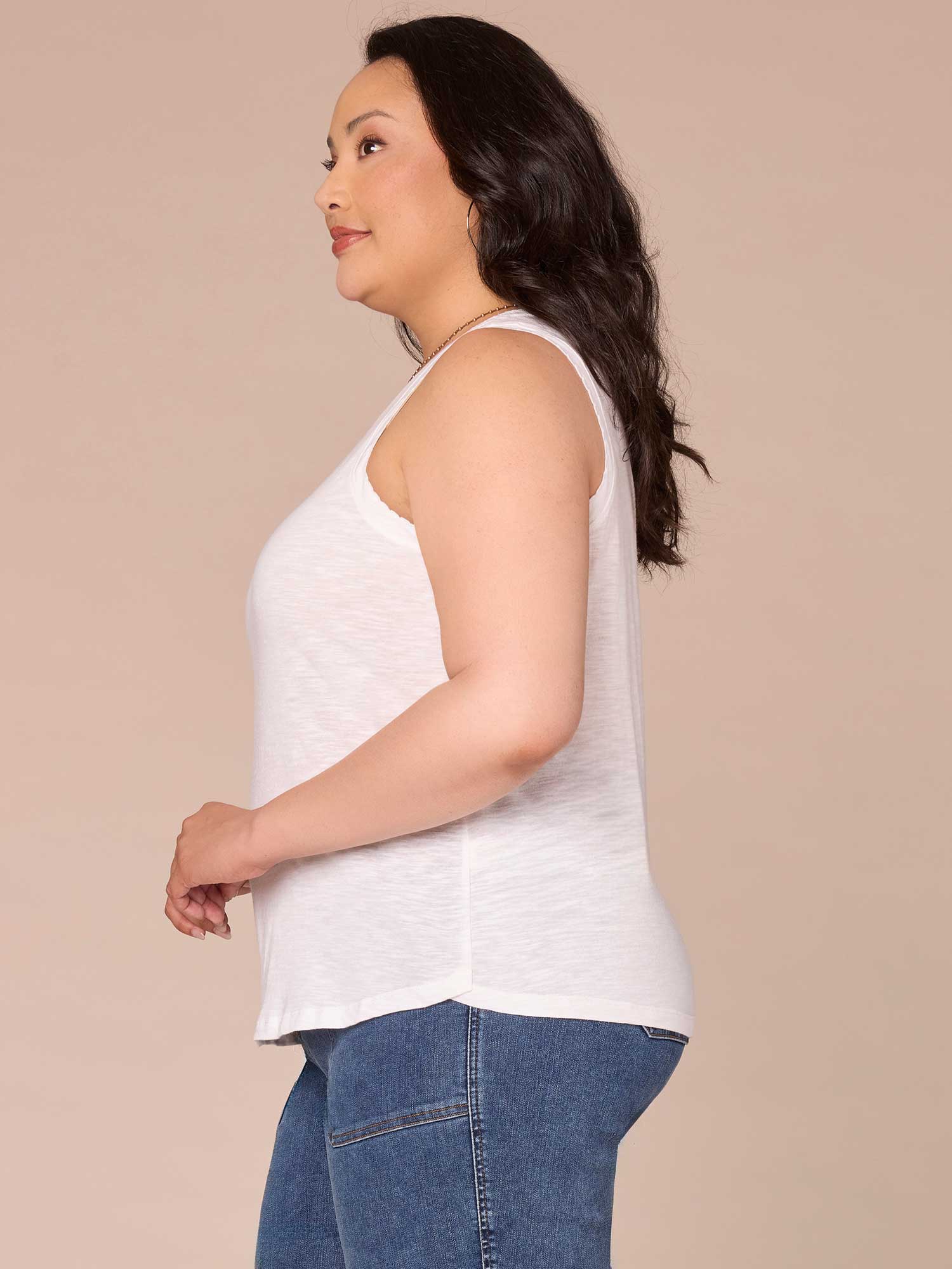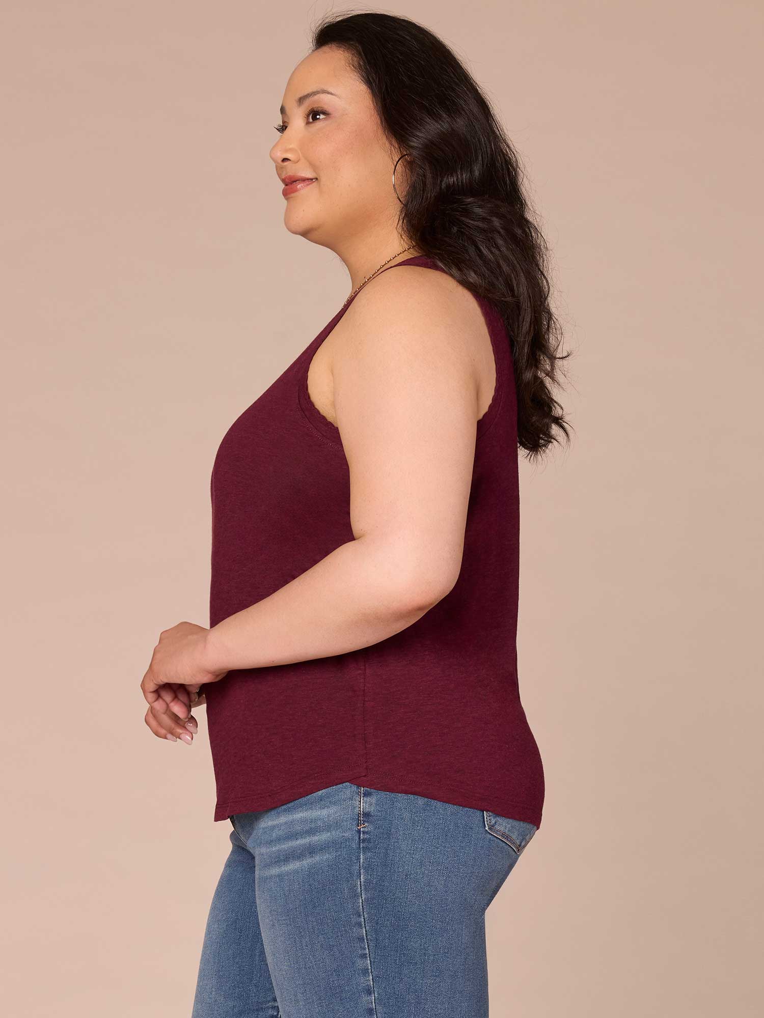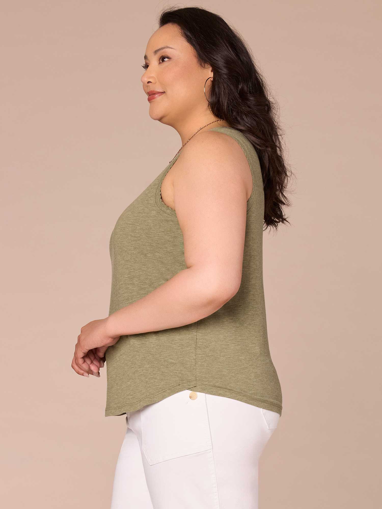 Wear this knit tank top in plus sizing on its own or underneath a jacket for a put-together, layered look. It has a sweetheart neckline, shell tuck embroidery, and a shirttail hem.