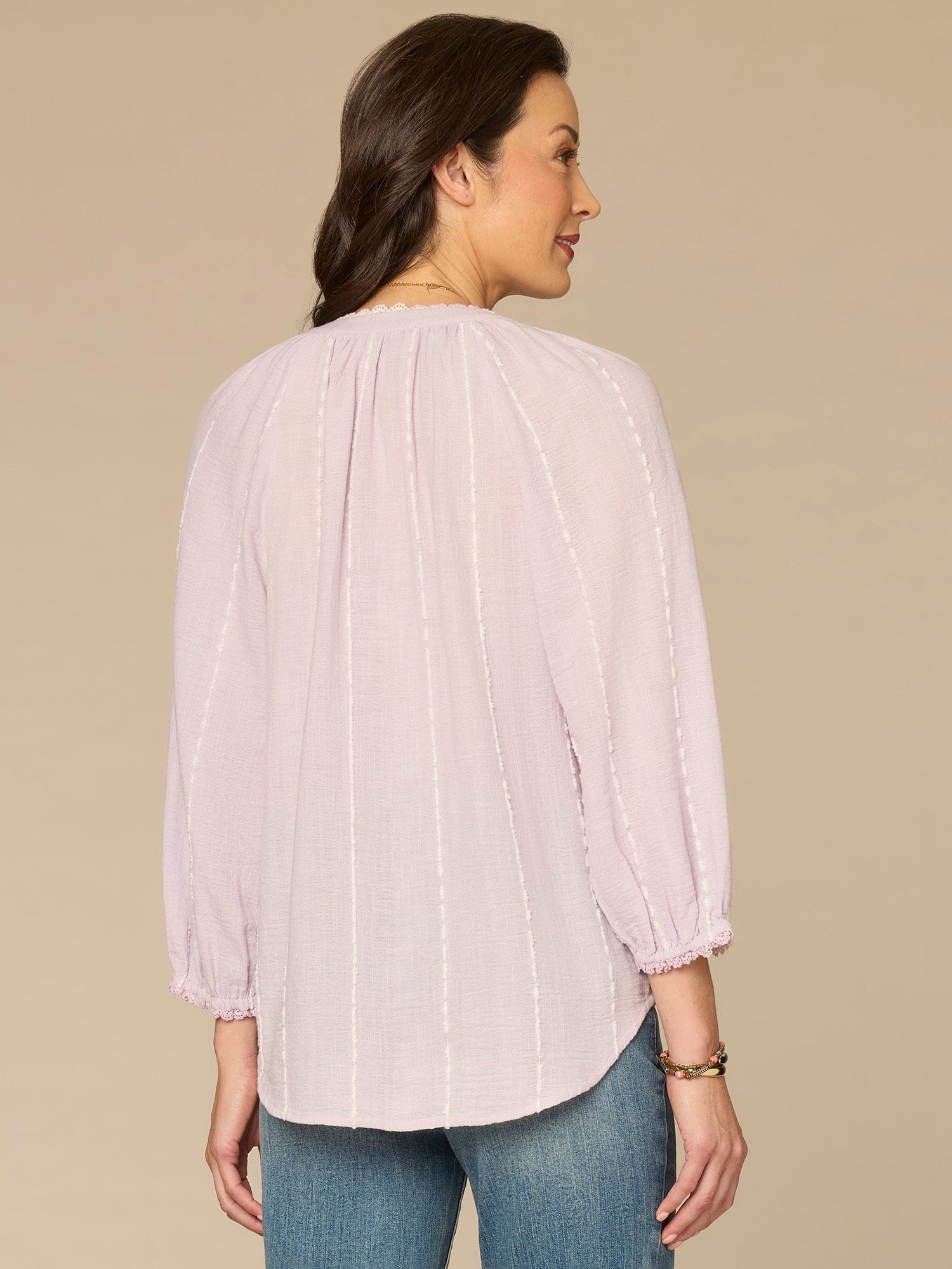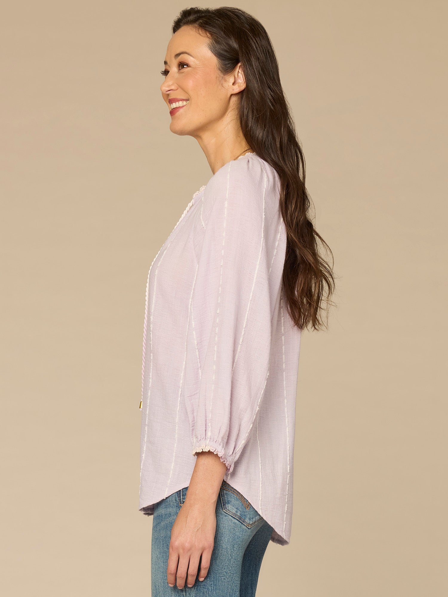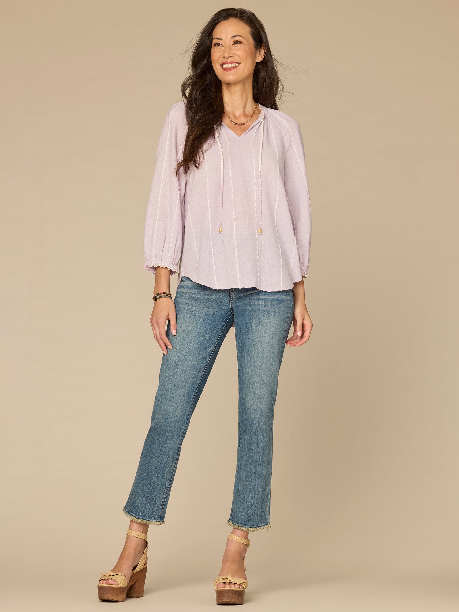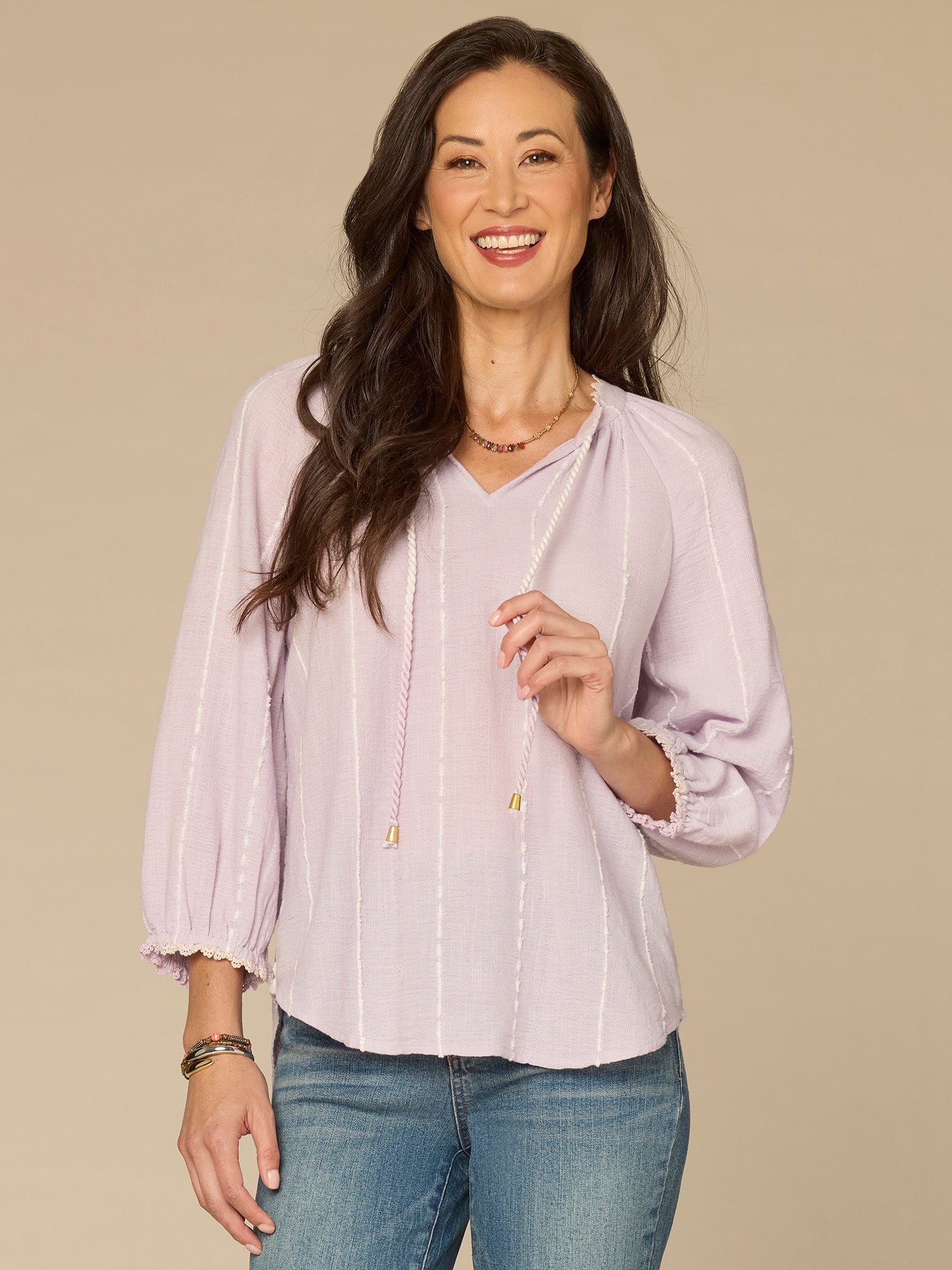 Classic, cool, and full of feminine detailing, this woven top is about to become your new favorite go-to. It brings boho vibes with three quarter blouson sleeves, a split neck with a braided tie, and vertical embroidered stripes.