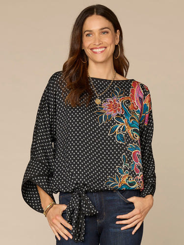 Look on-trend at festive celebrations and in-office days alike with this dolman sleeve woven top. It’s designed with a boat neck, piping detail, a gorgeous abstract placement print, and cute self bow on the hem.