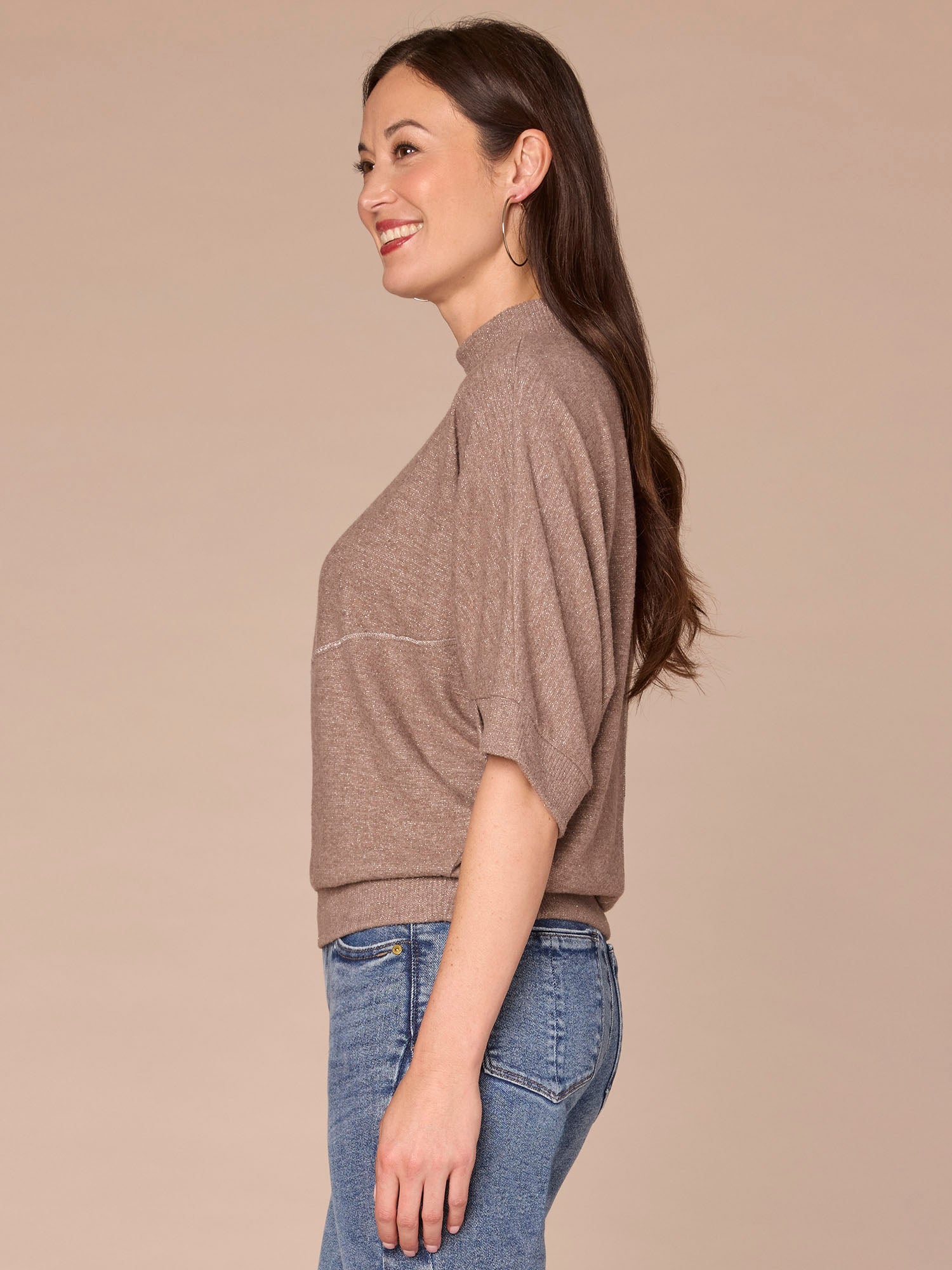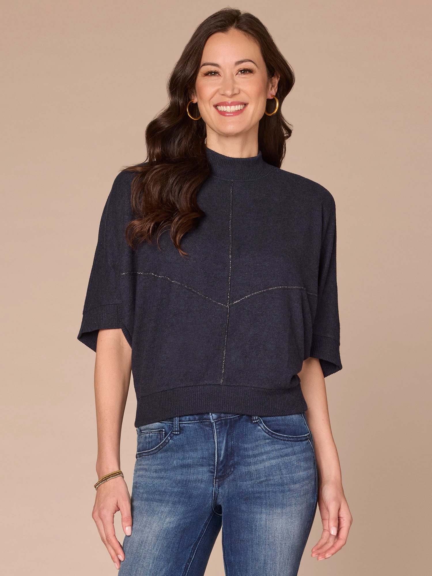 From festive get togethers to everyday errands, add a touch of shine to your day with this knit top. It features three quarter dolman sleeves, a mock neck, banded hem, and metallic seaming detail.
