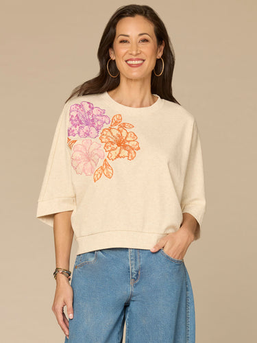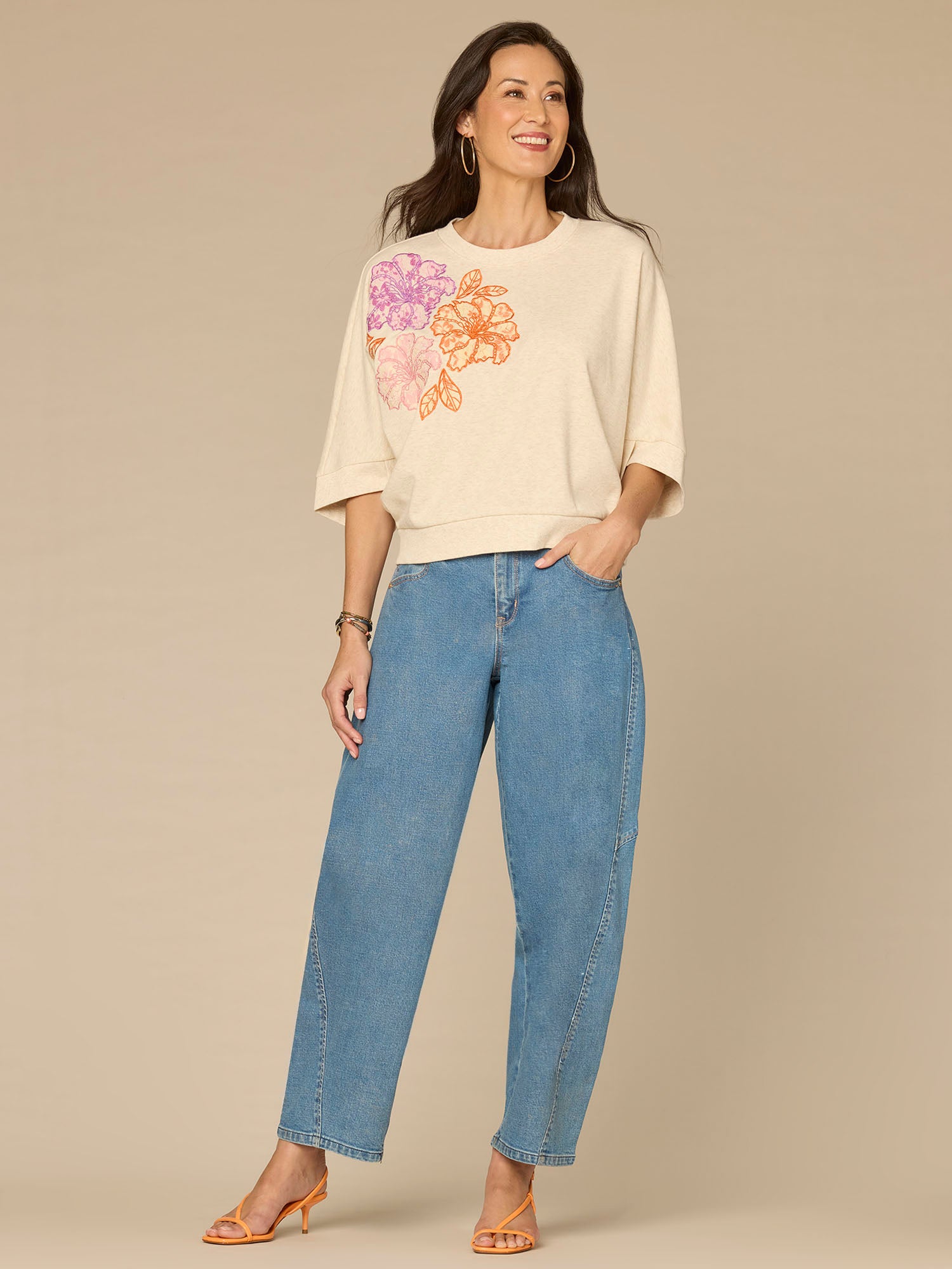 Lean into cute and comfortable styles this season, like this petite knit top with an embroidered floral patch front. Its three quarter dolman sleeves, scoop neck, and straight banded hem bring all the style your outfit needs.