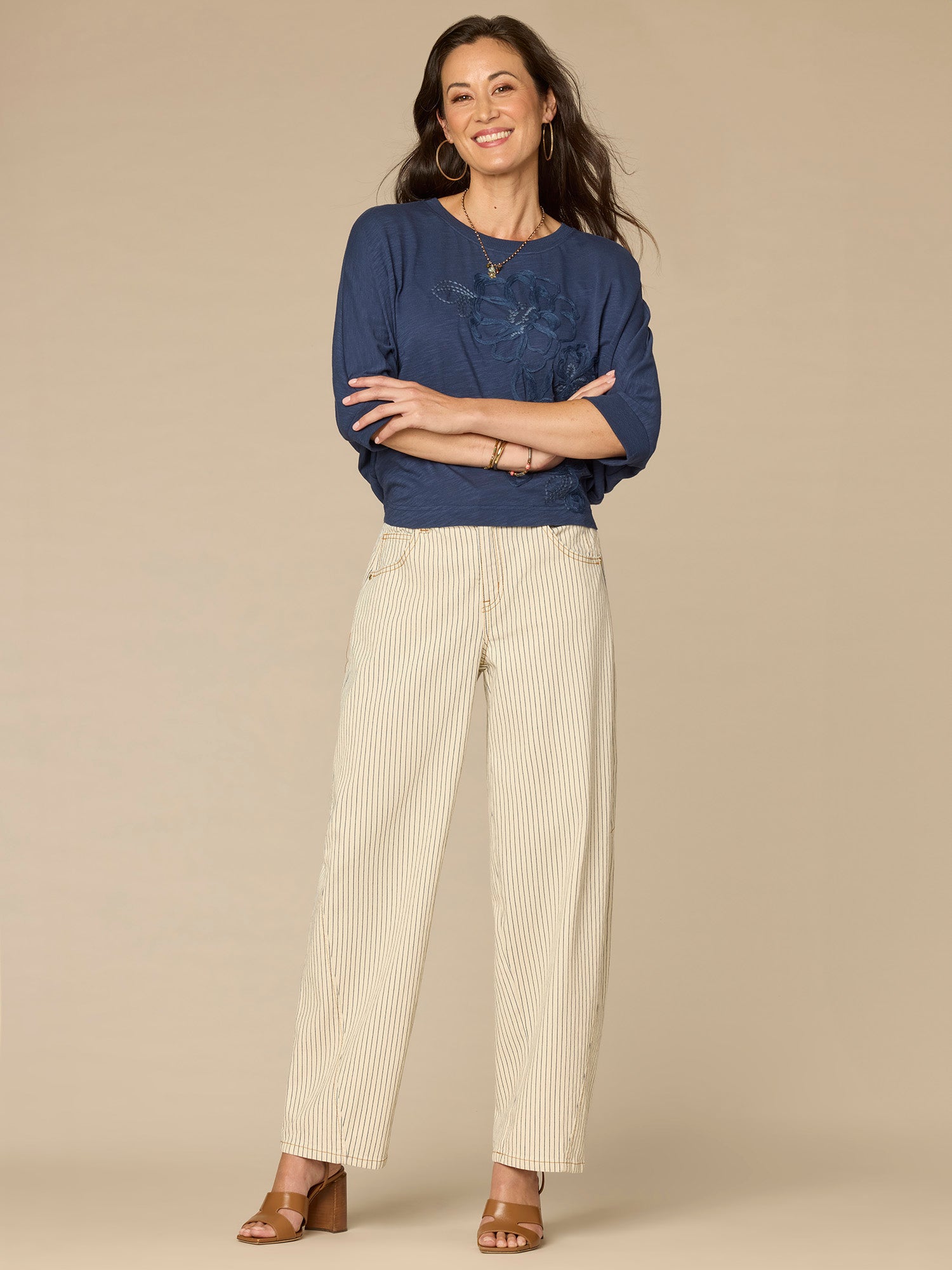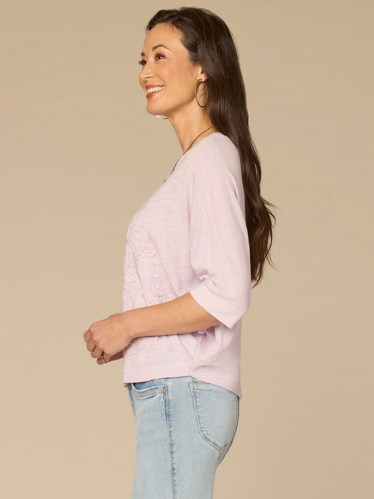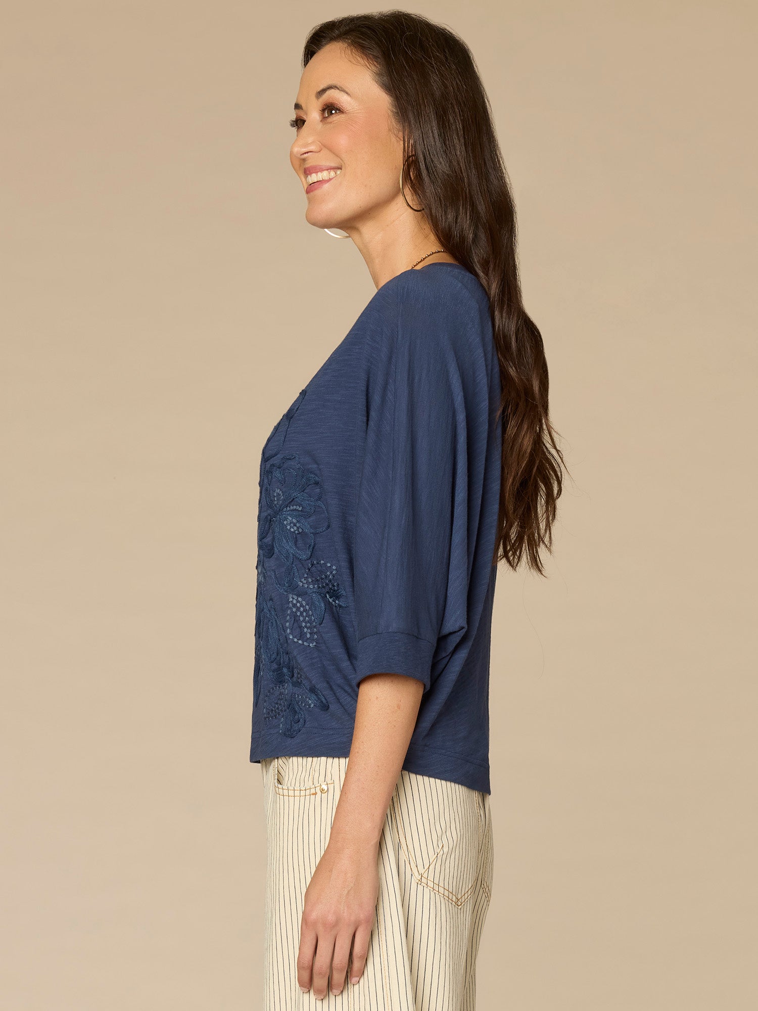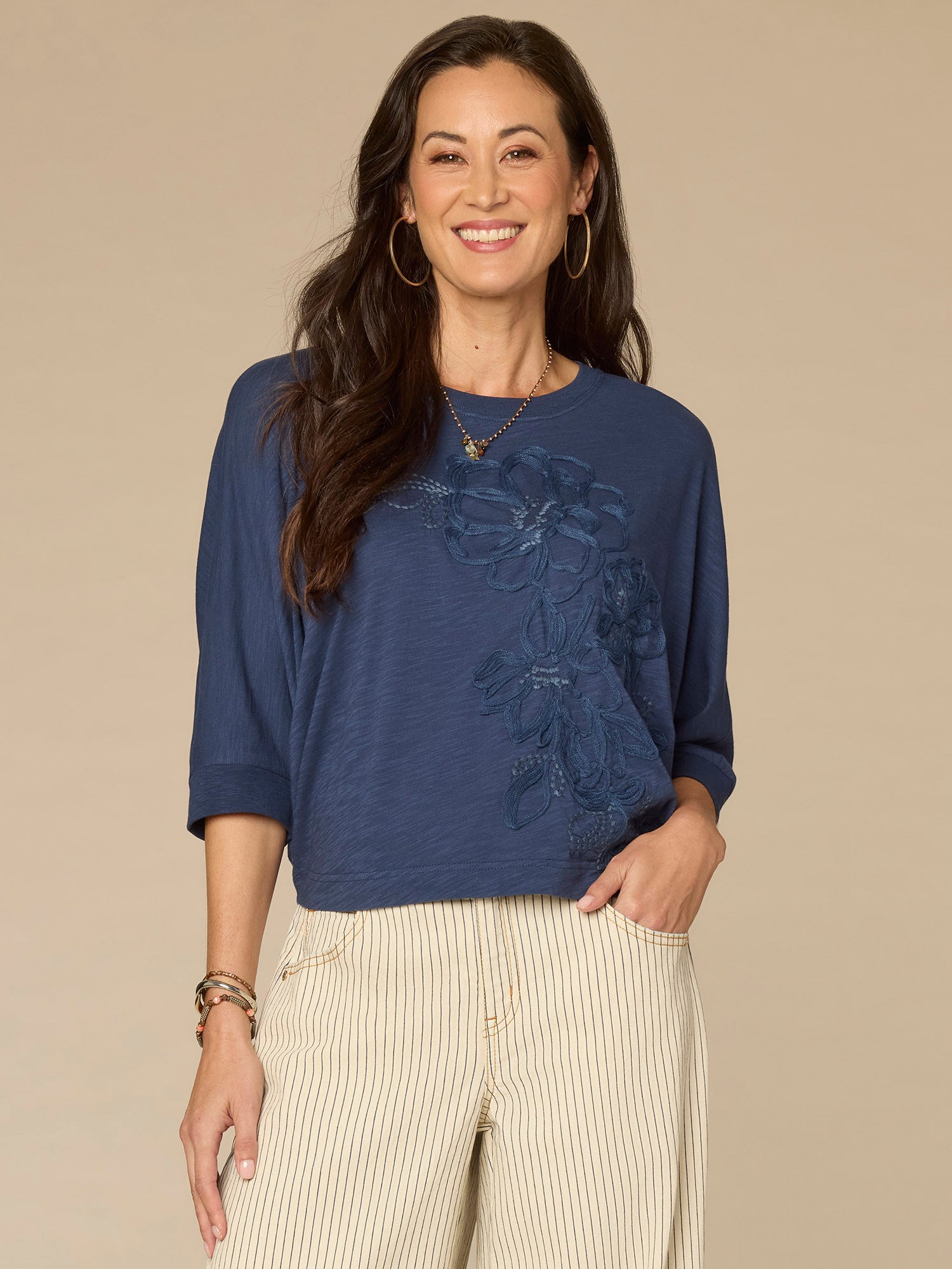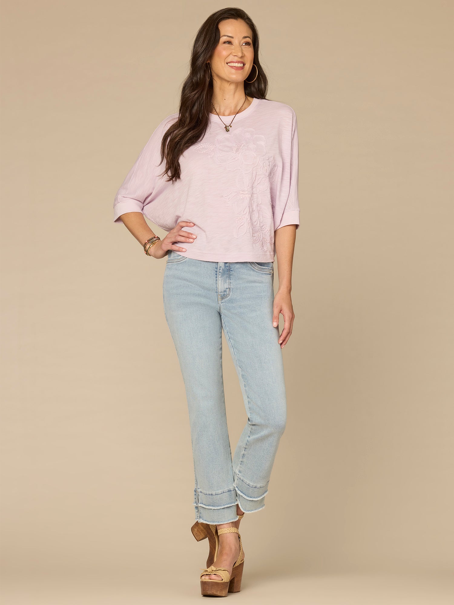 This petite knit top is sure to become a repeat go-to. It’s designed with three quarter dolman batwing sleeves, a classic scoop neck, and floral embroidery.