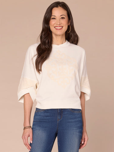 This mixed media knit top in off white and natural hues adds cool, modern design details to every look. It has three quarter dolman sleeves, a round surplus neck, a straight banded hem, and die cut embroidery.