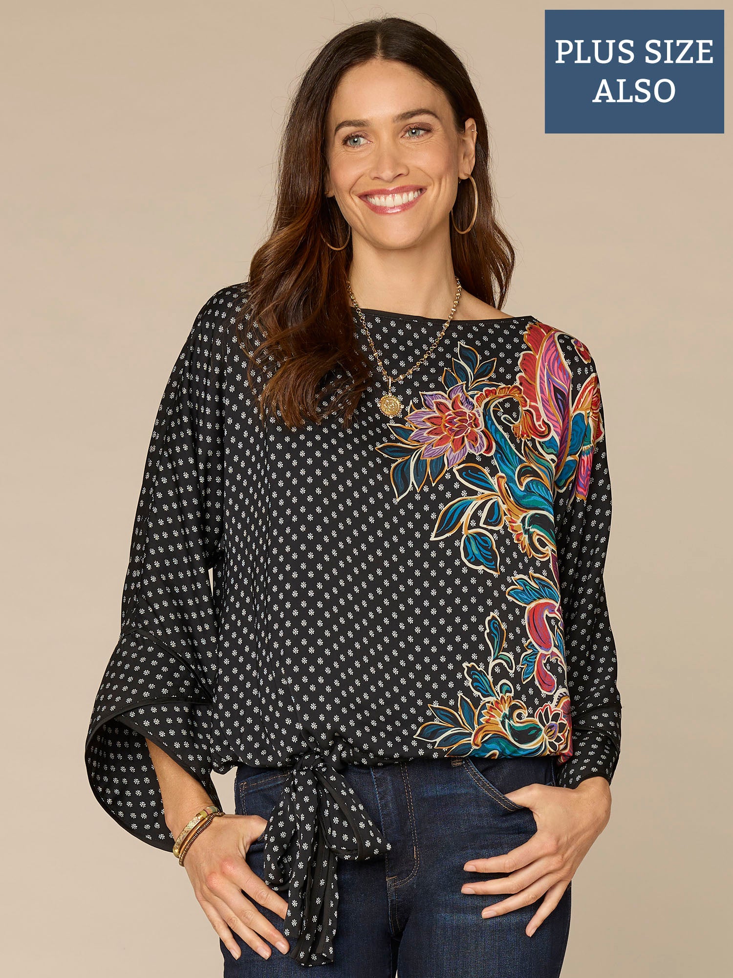 Look on-trend at festive celebrations and in-office days alike with this dolman sleeve woven top in plus sizing. It’s designed with a boat neck, piping detail, a gorgeous abstract placement print, and cute self bow on the hem.