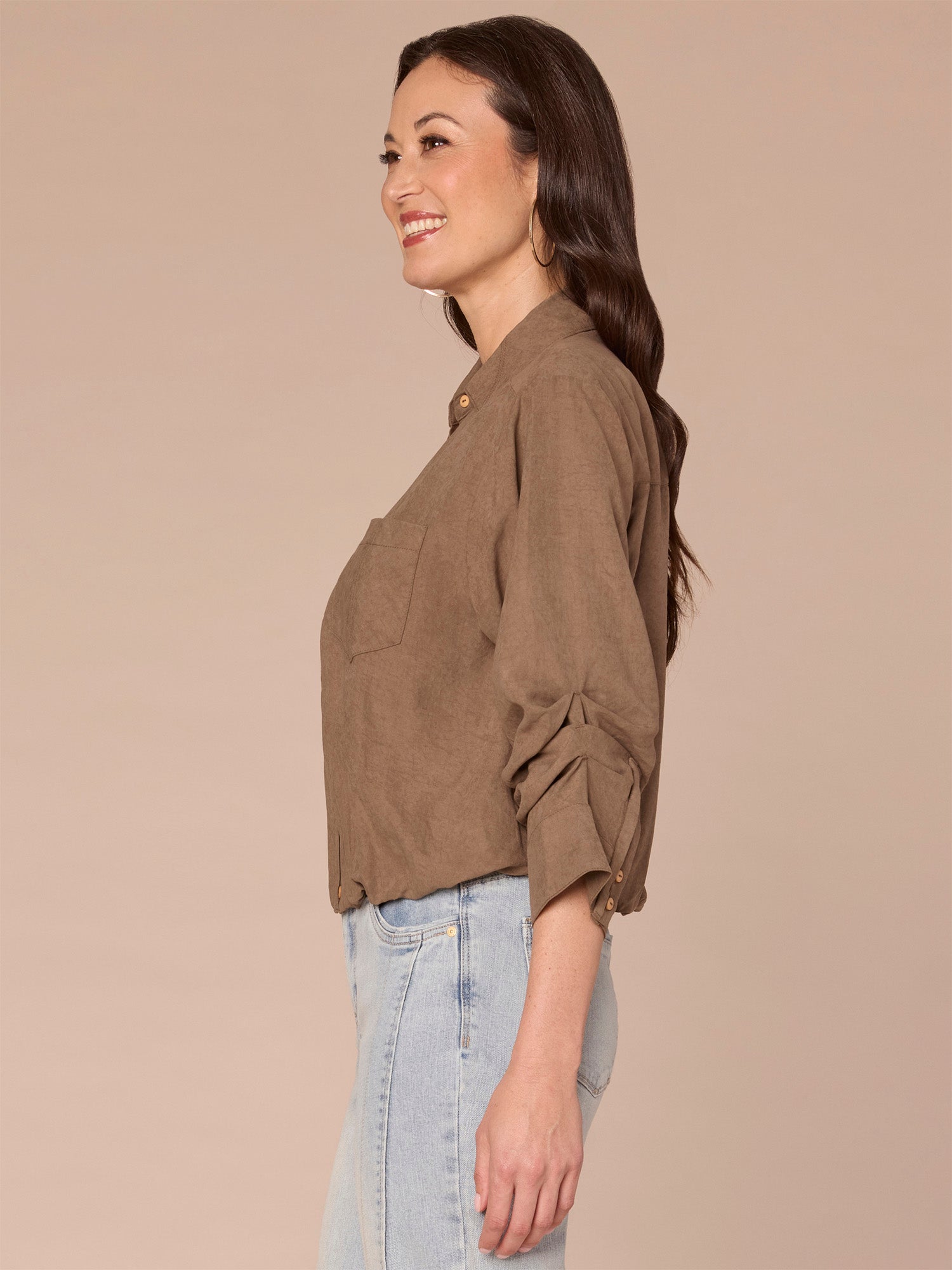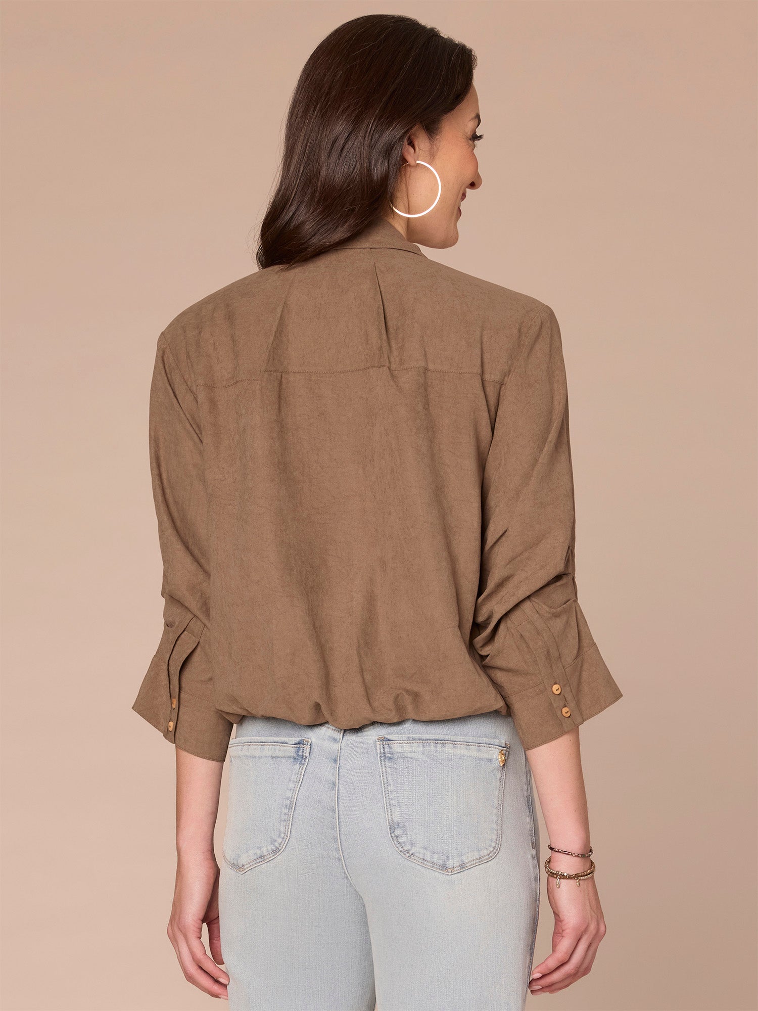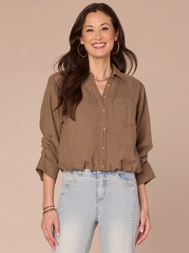 You don’t need to sacrifice comfort for style with this office-friendly woven button down shirt in petite sizing. It’s designed with three quarter tucked sleeves, a collared V-neck, front spade pocket, and a cinched bubble hem.