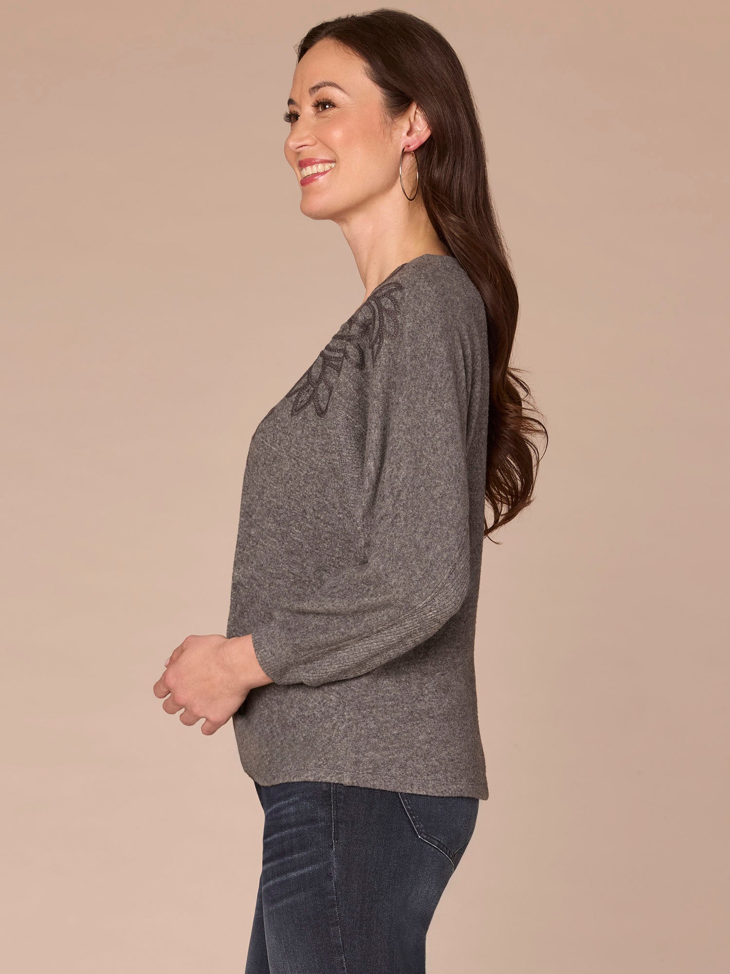 Although this mixed media knit top in petite sizing is super cozy, it’s not basic. Banded three quarter sleeves, a mandarin collar, V-placket, embroidered soutache detailing, and a twist front add visual interest and shape to your look.