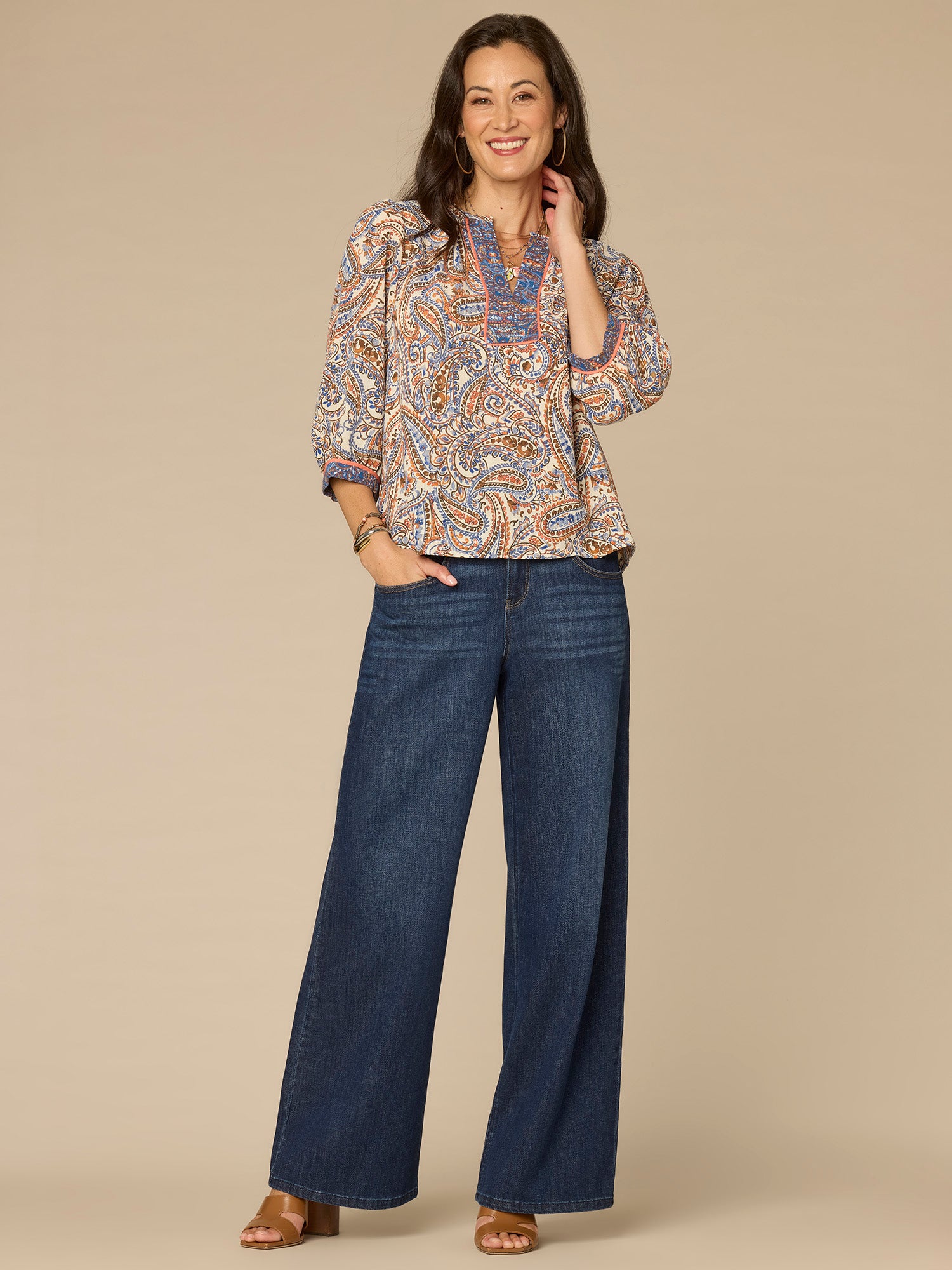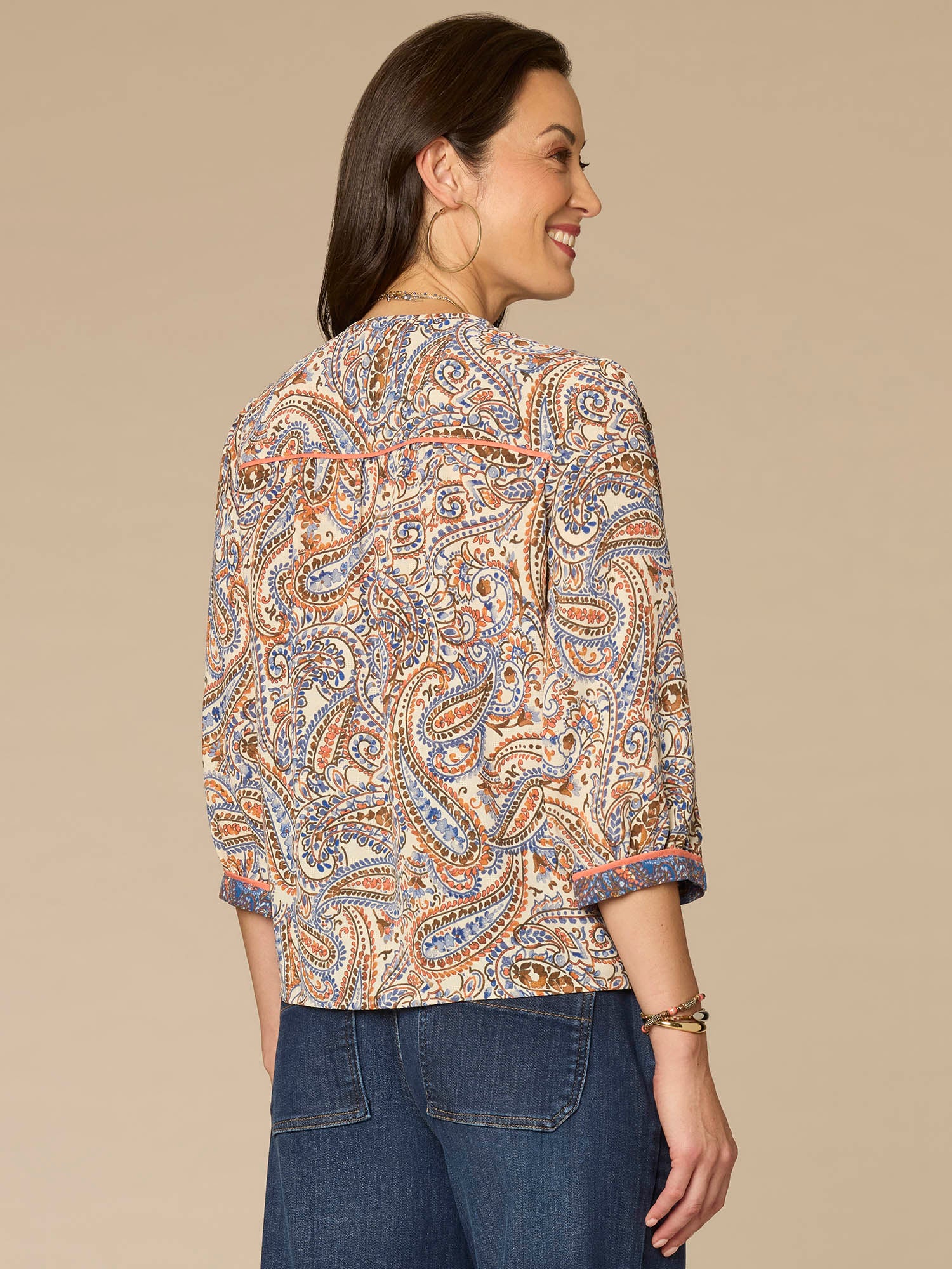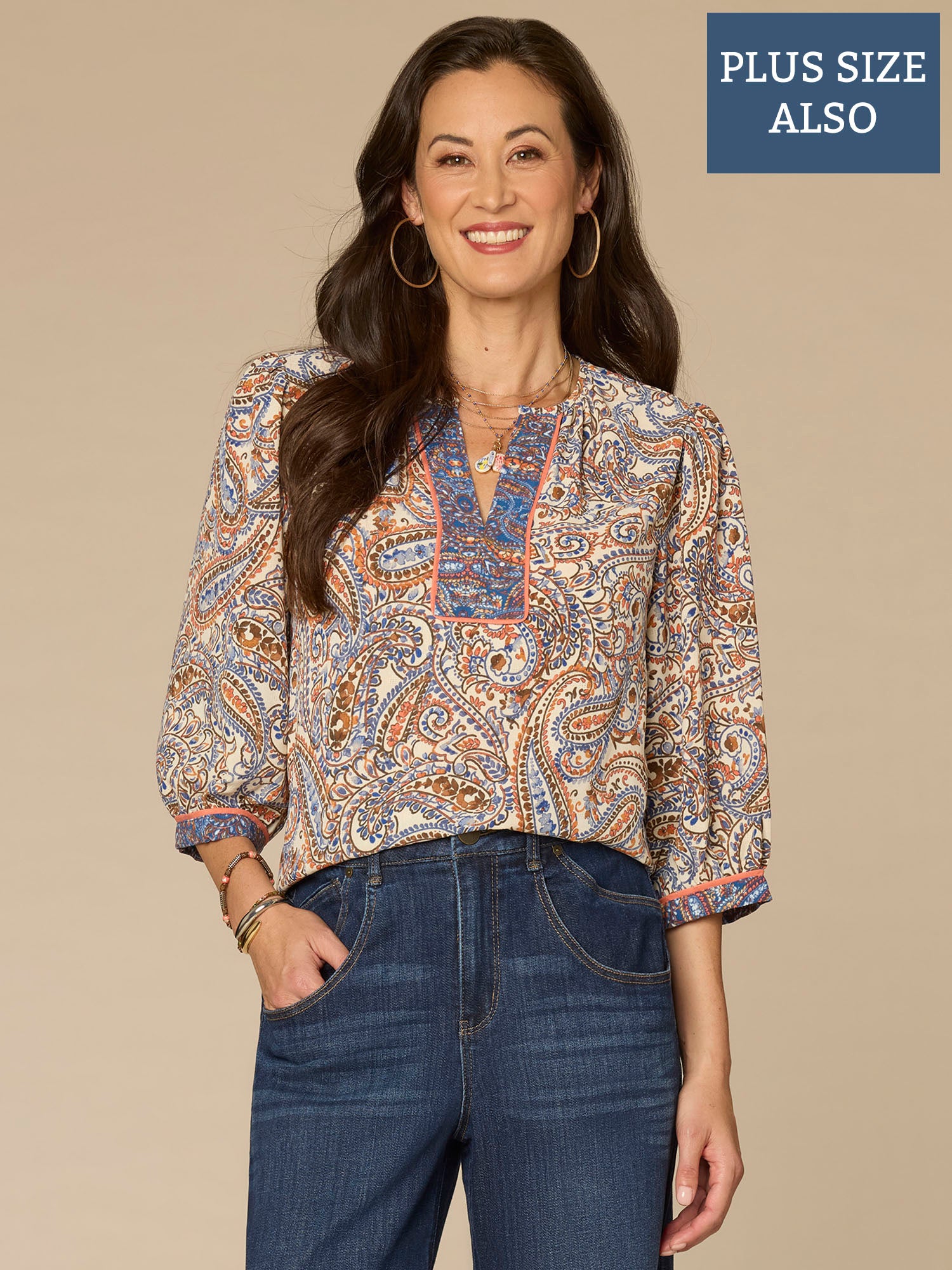 Versatile and effortless, this plus-size woven top brings style and comfort to your everyday wardrobe. It has three quarter blouson sleeves, a V-notch neck with a half placket, and a subtle paisley placement print that pops.