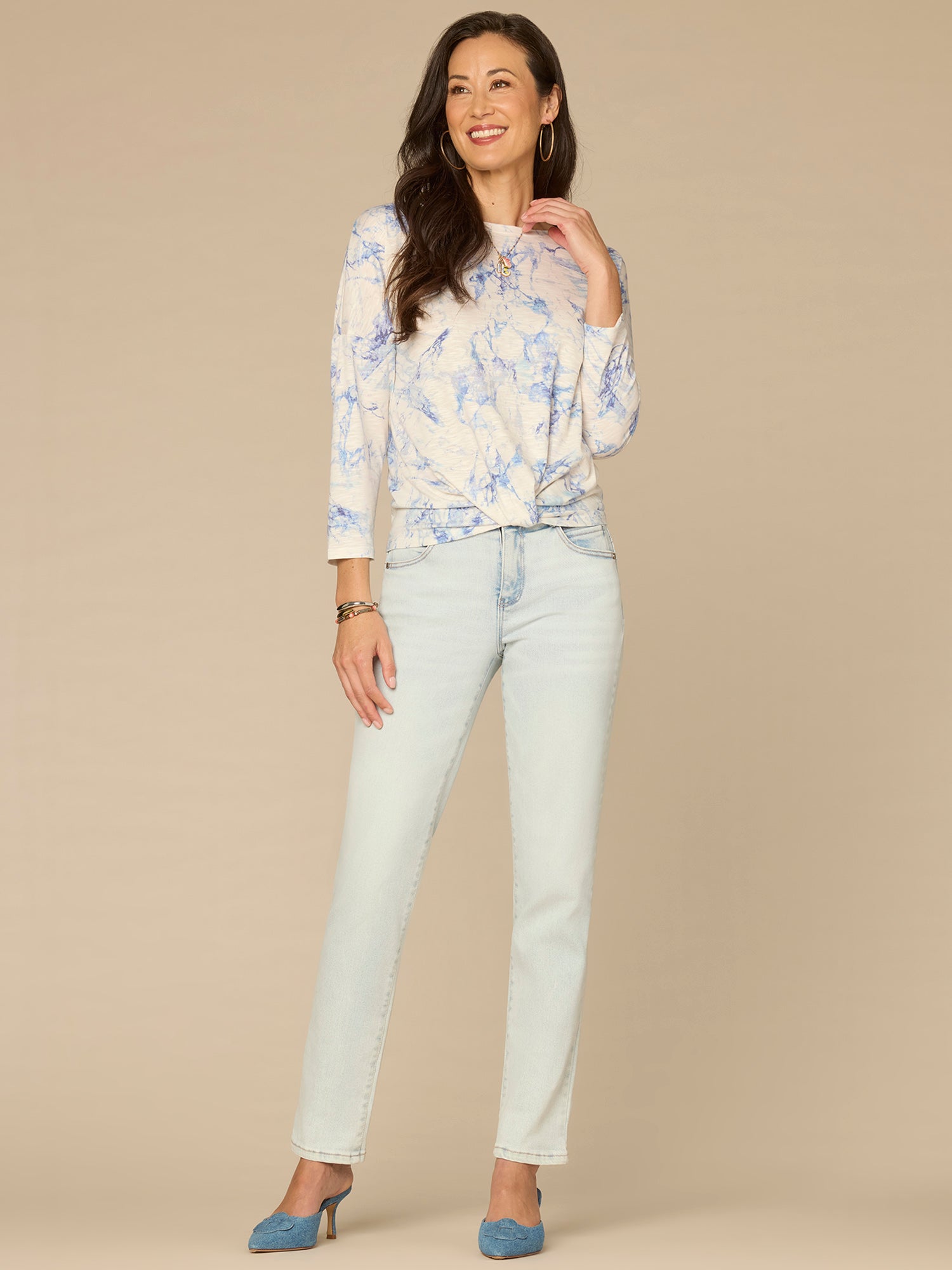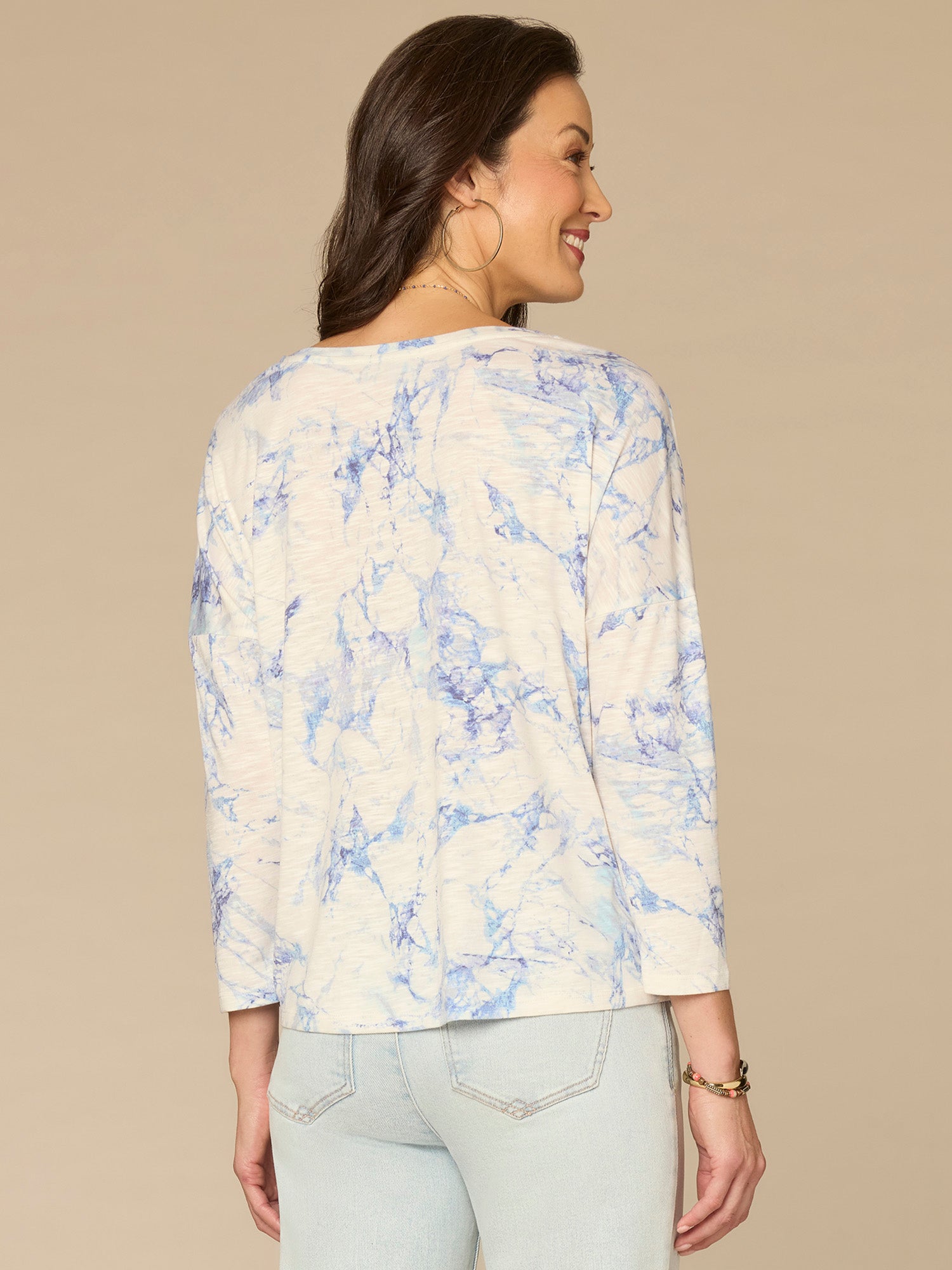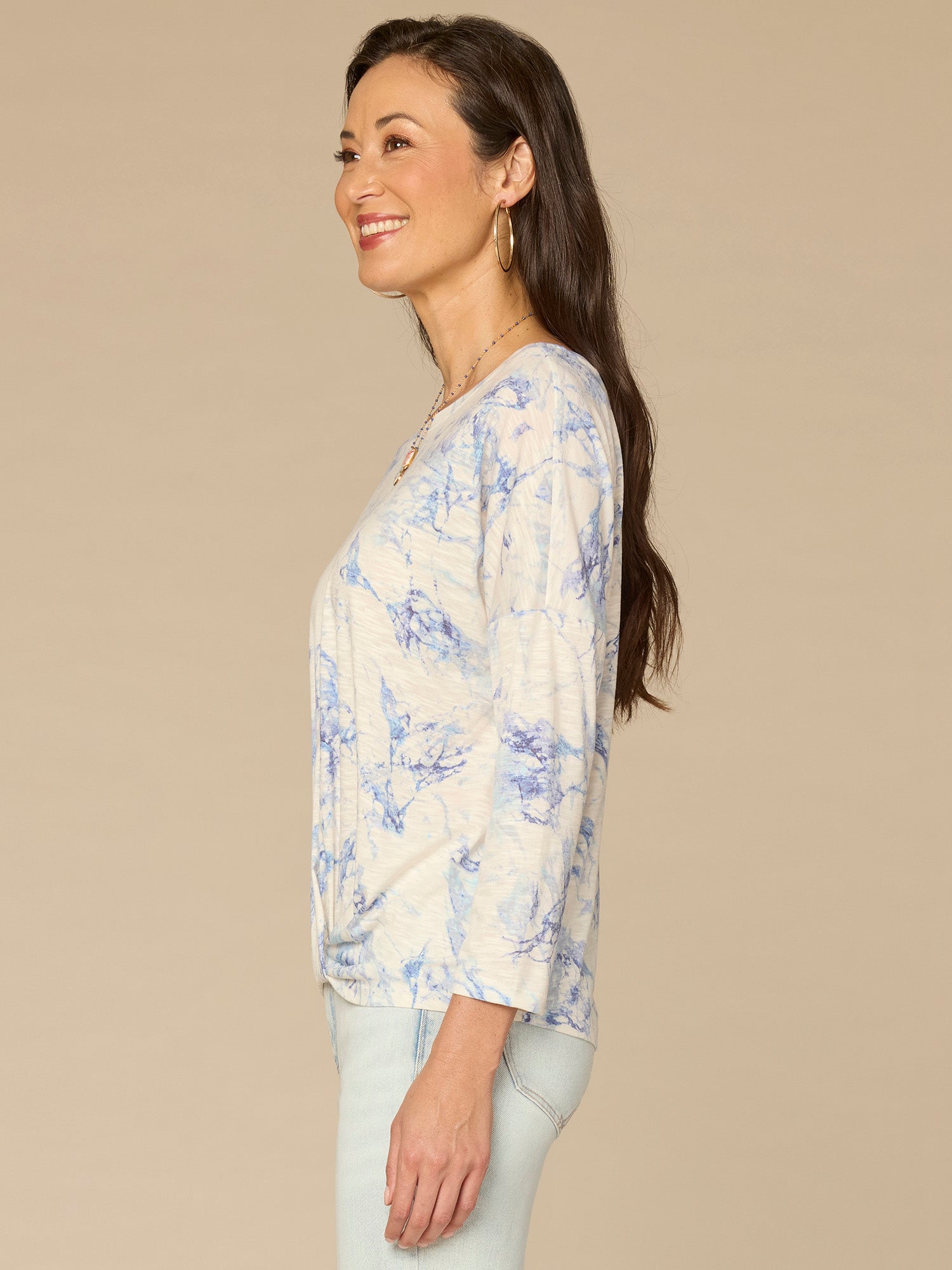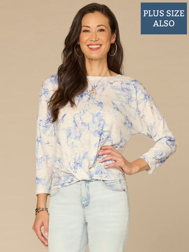 With a classic fit and on-trend marble print, you’ll reach for this plus-size knit top repeatedly. It’s also designed with three quarter drop shoulder sleeves, a scoop neck, and twist front hem.