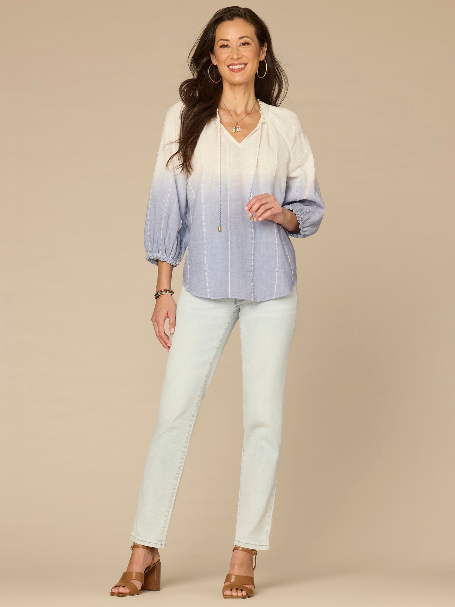 This light and flowy woven top in plus sizing is an effortless weekend staple. It features three quarter sleeves, a split neck with a braided tie, crochet edge trim detailing, and an ombre design.