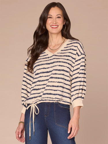 Keep warm in this knit top, featuring three quarter blouson sleeves, a surplus V-neck, cased hem, off-center tie, and embroidered jacquard bands. Its striped, dual-toned design make it an effortless choice, whatever your day has in store.