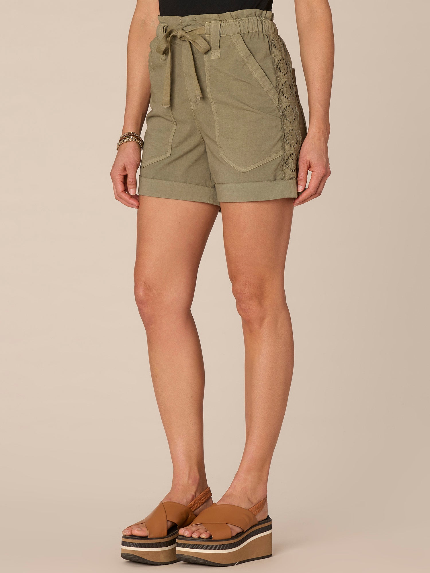 These super soft woven shorts are fitted at the hips with an easy, relaxed leg opening. Designed with on-trend elements like an ultra skyrise paper bag waist with a tie, V-yoke, side panels, and a fixed roll cuff.