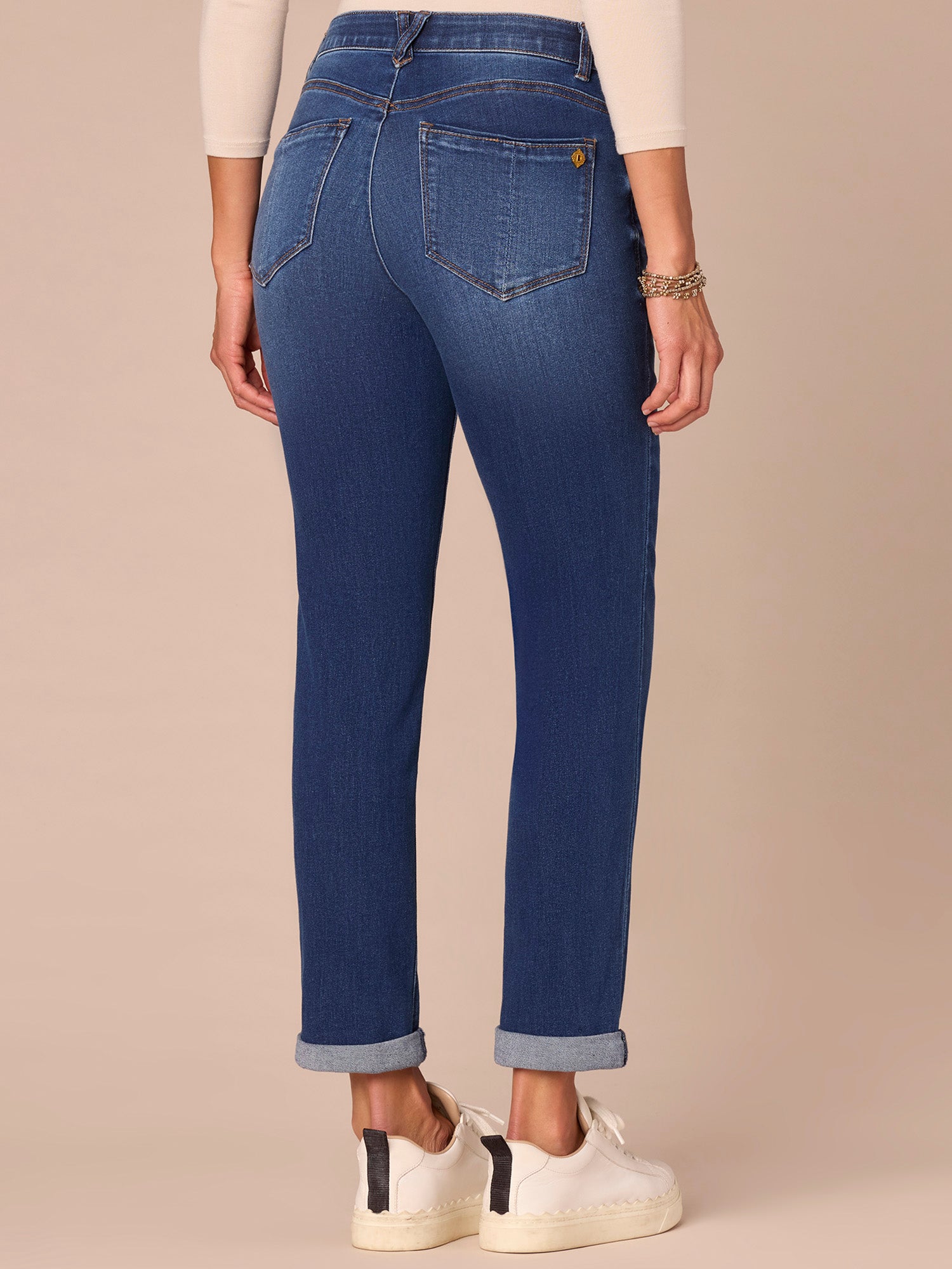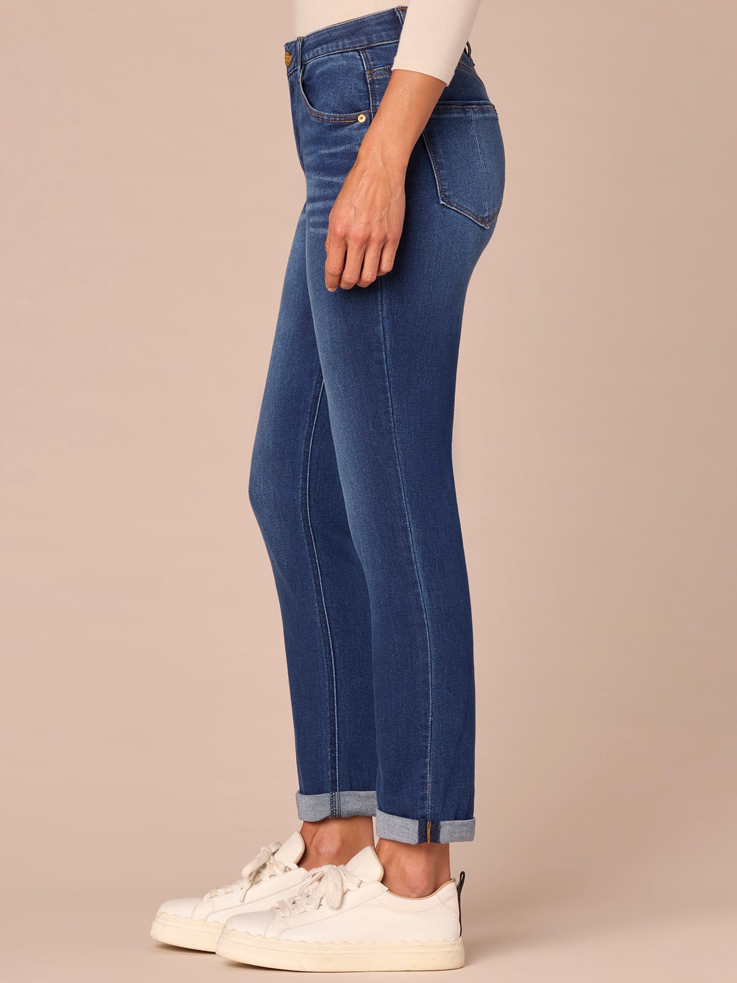 Our "Ab"solution® Girlfriend style is fitted through the thigh, with a relaxed fit from the knee to the leg opening. Wear them cuffed for a classic Girlfriend silhouette, or release the cuff for an even more relaxed look. Engineered with our signature fit technology to smooth, support, and enhance your shape—giving you everything from a flatter tummy to a perkier rear view. Made with recycled REPREVE® materials for a greener solution.